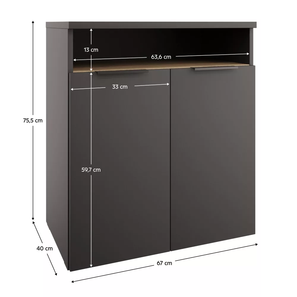 A tároló belső elrendezése rendkívül átgondolt: a kétajtós kialakítás mögött egy polcos rész található, amely mellett egy nyitott tárolóhely is helyet kapott, így a gyakran használt tárgyak és a bizalmasabb dokumentumok egyaránt rendezetten tárolhatók. A bútor stabilitását és a padló védelmét a 0,5 cm magas műanyag csúszkák szavatolják, amelyek a mozgatást is megkönnyítik. A maximális biztonság érdekében javasoljuk a szekrény falhoz rögzítését.