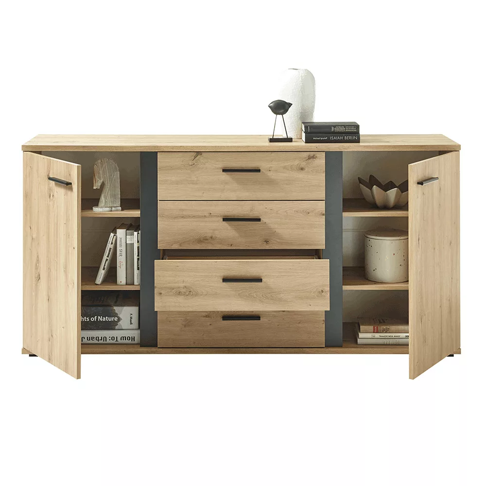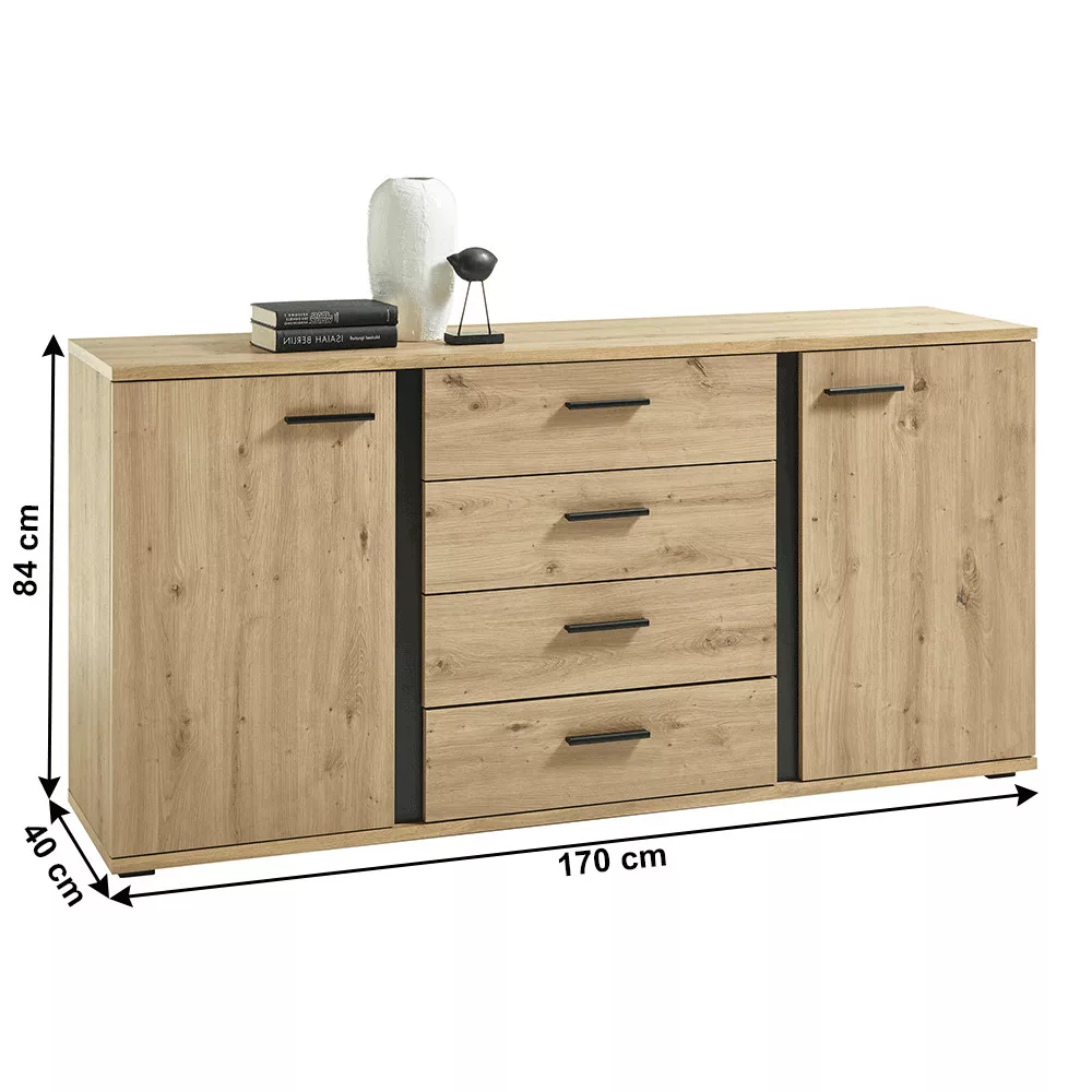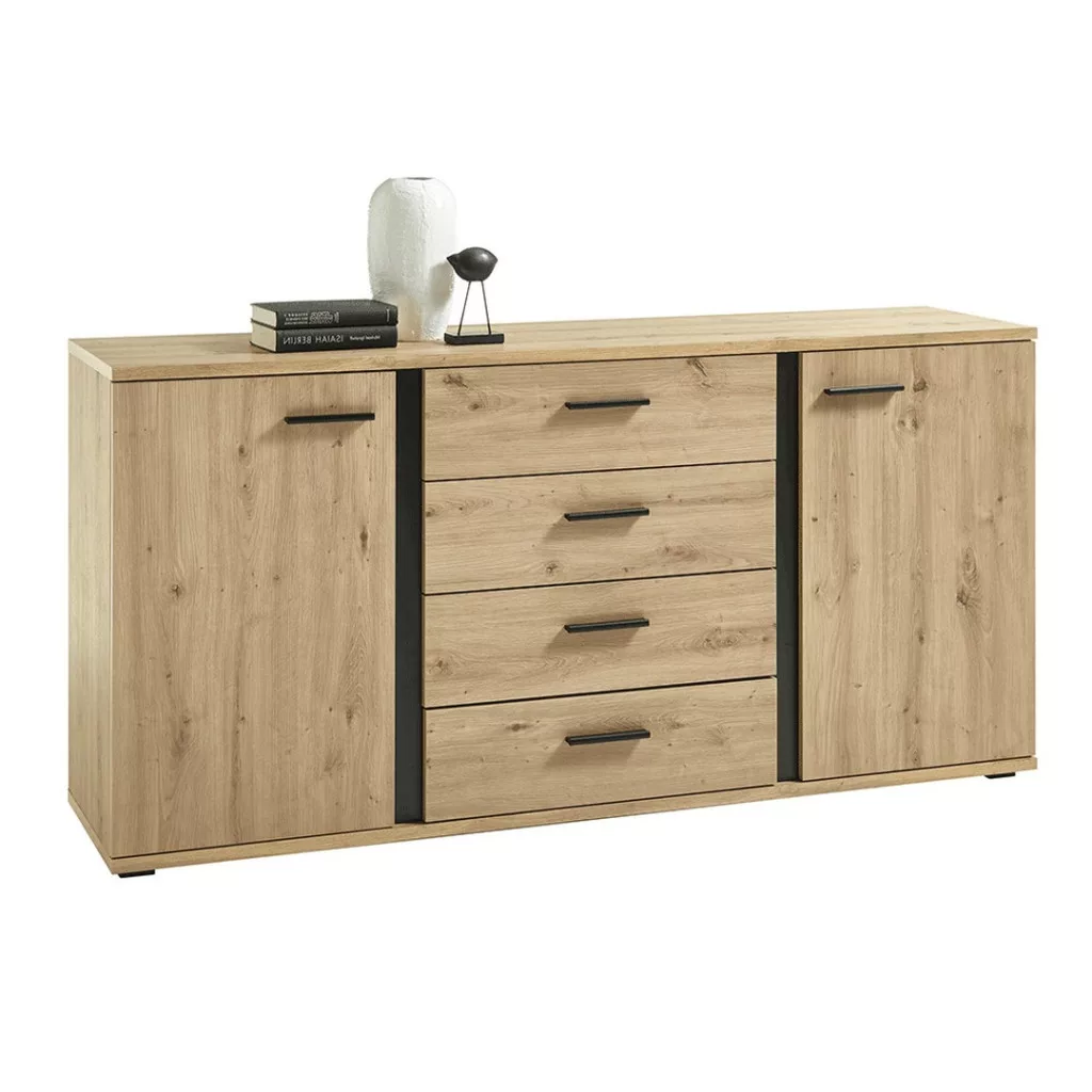 A KANODE tervezésekor a cél egy olyan multifunkcionális tároló szekrény megalkotása volt, amely a nappali, a hálószoba vagy akár az előszoba központi elemévé válhat. A letisztult vonalvezetést a markáns, fekete fogantyúk törik meg, modern kontrasztot adva a meleg fa hatású felületnek. A bőséges tárolóhelyet két tágas szekrényrész és négy fiók biztosítja, így ez a komód ideális választás lehet akár ruhás komódként is, de helyet kaphatnak benne a családi dokumentumok, társasjátékok vagy a mindennapi használati tárgyak is. Egy igazán sokoldalú és időtlen darab, amely kivételes légkört teremt.