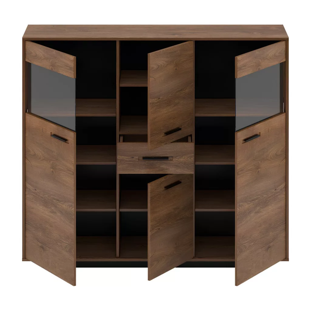 - Kialakítás: Négyajtós komód tágas, polcos belsővel és 1 fiókkal.