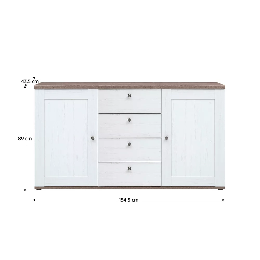 - Kialakítás: Kétajtós, polcos szekrényrész és 4 fiók