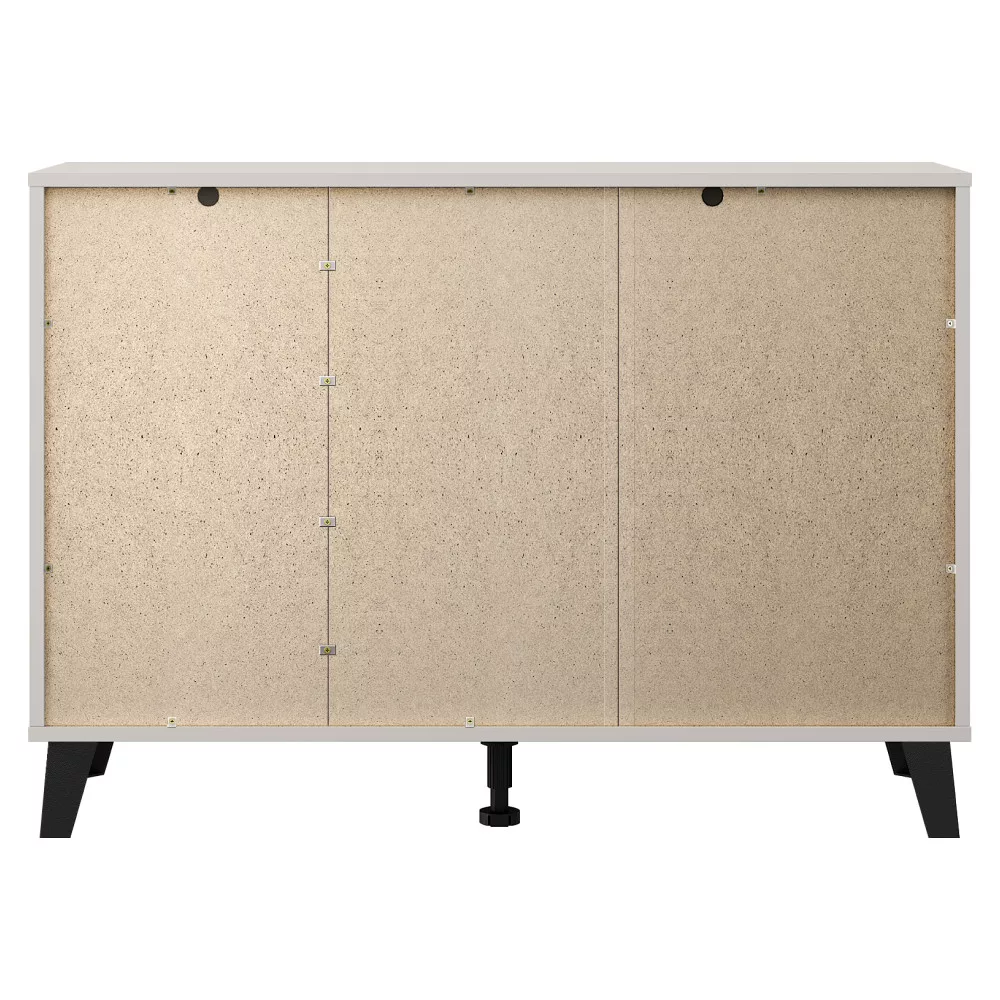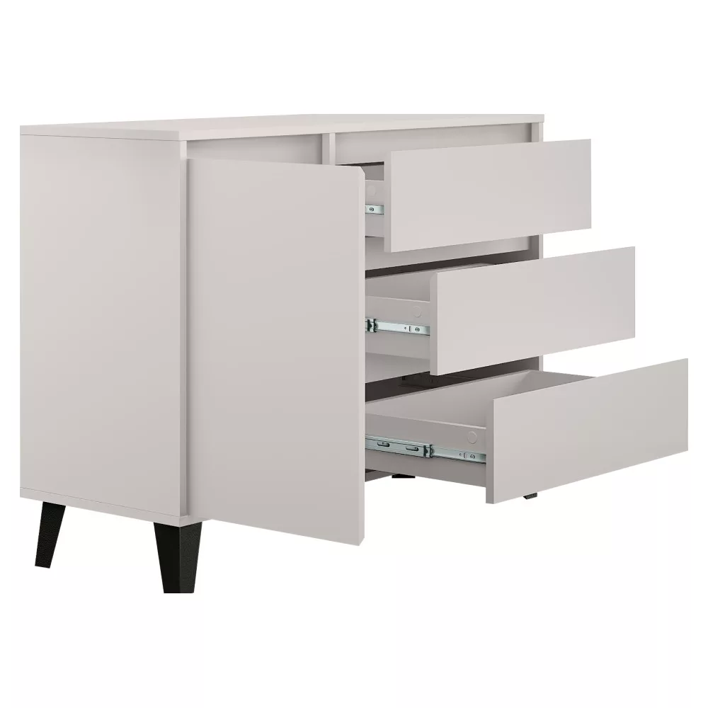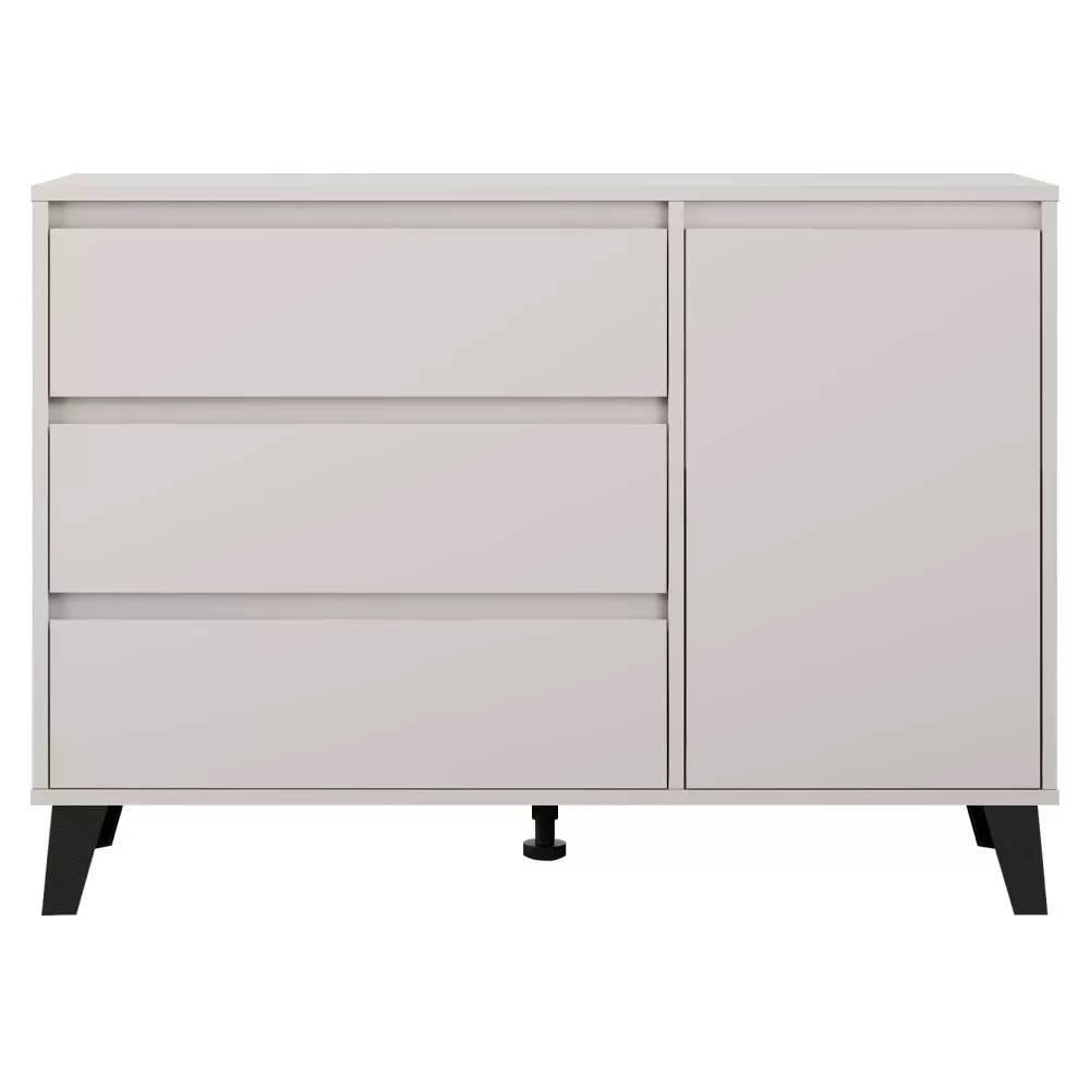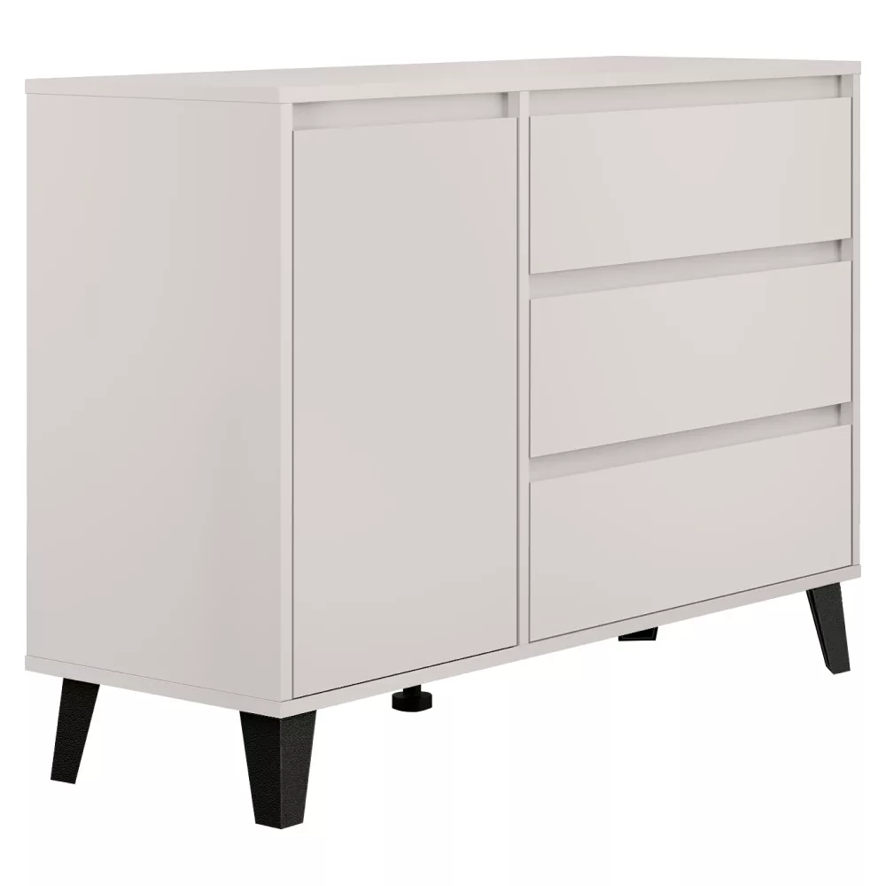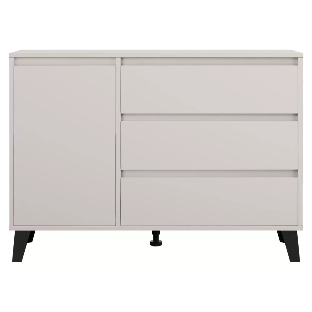 Ez a sokoldalú tároló szekrény kiváló választás nappalik, hálószobák, de akár előszobák vagy étkezők berendezésére is. A tárolóhelyet egy univerzális kialakítású, polcos ajtós rész és három tágas fiók biztosítja, így ideális választás lehet akár ruhás komódként is. A bútort stabil, fekete színű lábak emelik el a padlótól, ami nemcsak a modern megjelenést erősíti, hanem a takarítást is megkönnyíti.