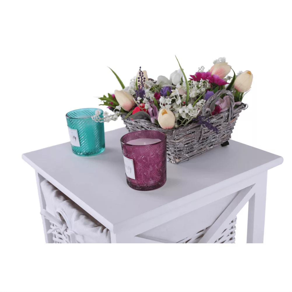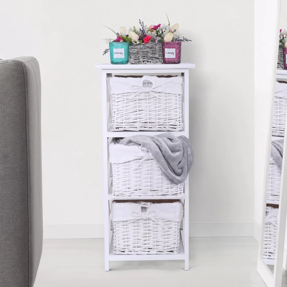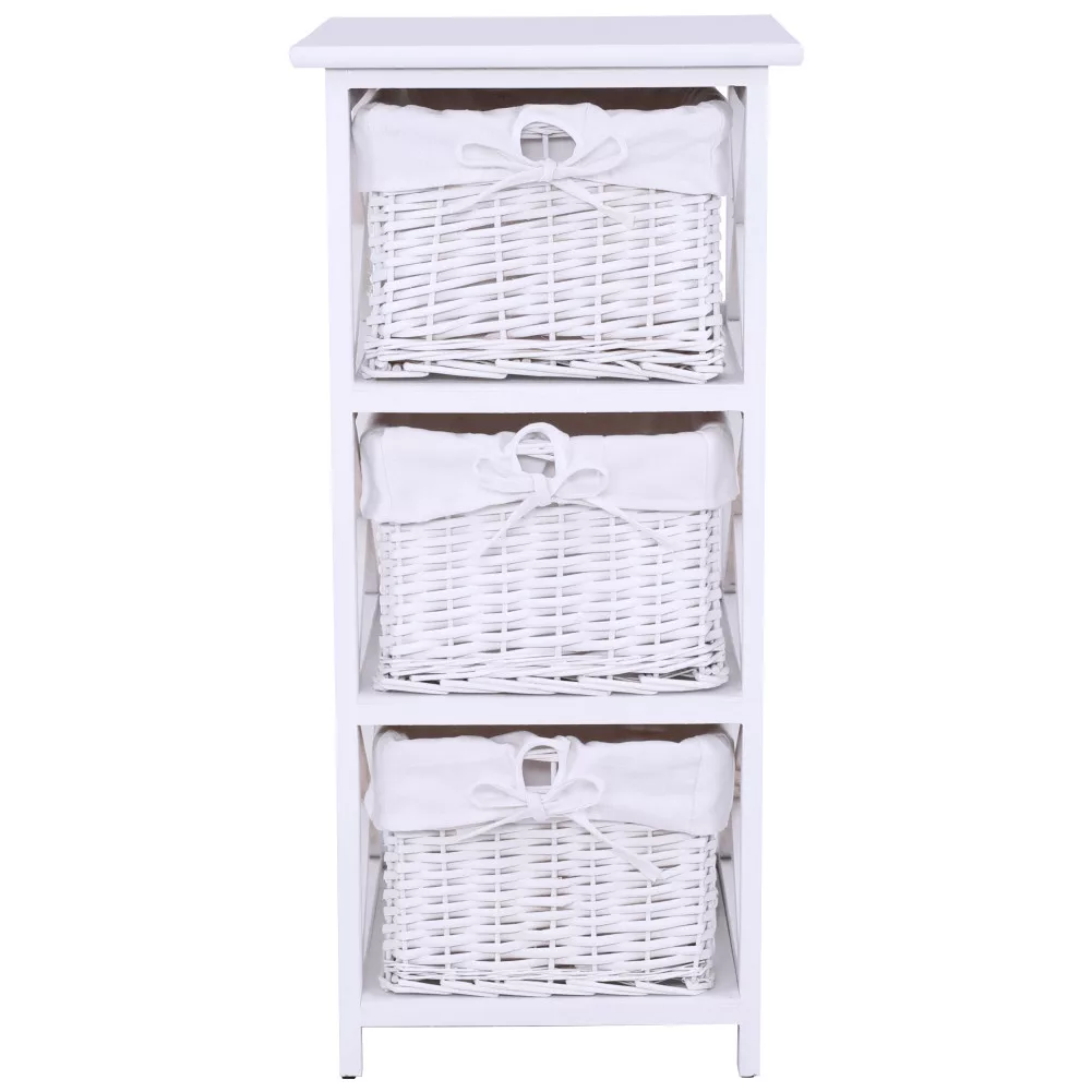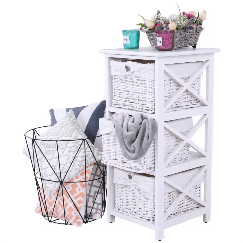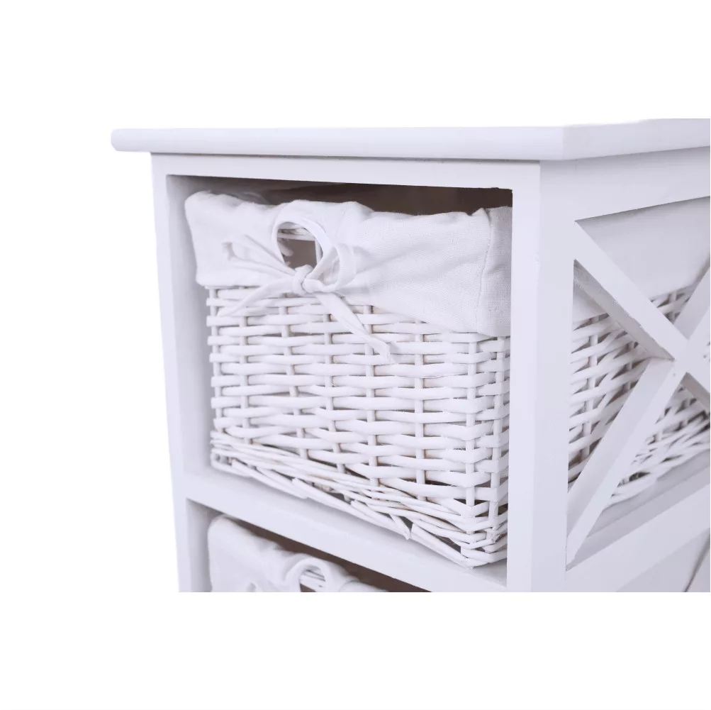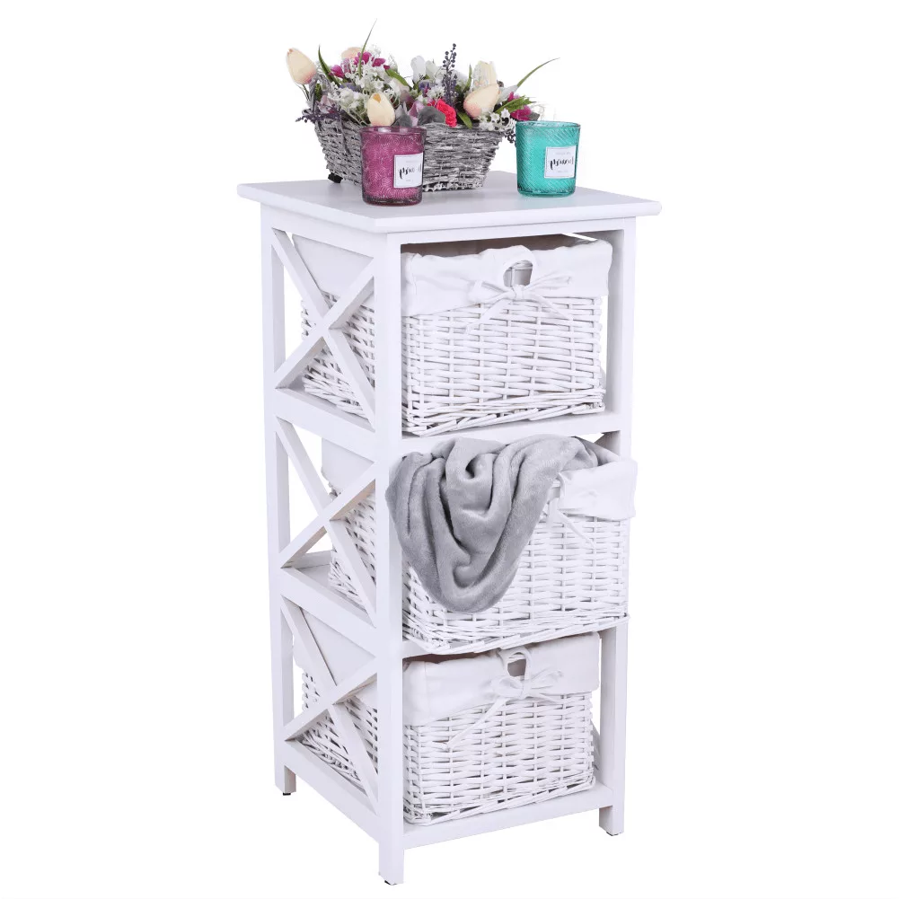 Egy otthon harmóniájának megteremtésekor kulcsfontosságú, hogy a tárolóbútorok ne csak praktikusak, hanem esztétikusak is legyenek. A RAFAELLO 3 komód pontosan ezt az egyensúlyt kínálja. Ez a bájos fiókos szekrény három tágas, fonott kosarával és letisztult, fehér színével ideális választás lehet előszobába, hálószobába vagy akár a fürdőszobába is. Minőségi anyagok, mint a vessző, a fa és a szövet harmonikus kombinációjából készült, így garantálva a tartósságot és az időtlen megjelenést.