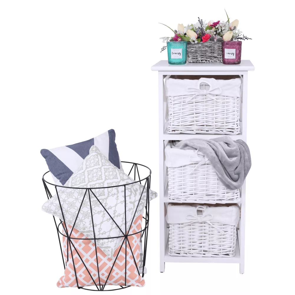 A három, fehér szövettel bélelt vesszőkosár nemcsak esztétikus, de rendkívül praktikus megoldást is nyújt a kisebb-nagyobb tárgyak, kiegészítők vagy textíliák rendezett tárolására.