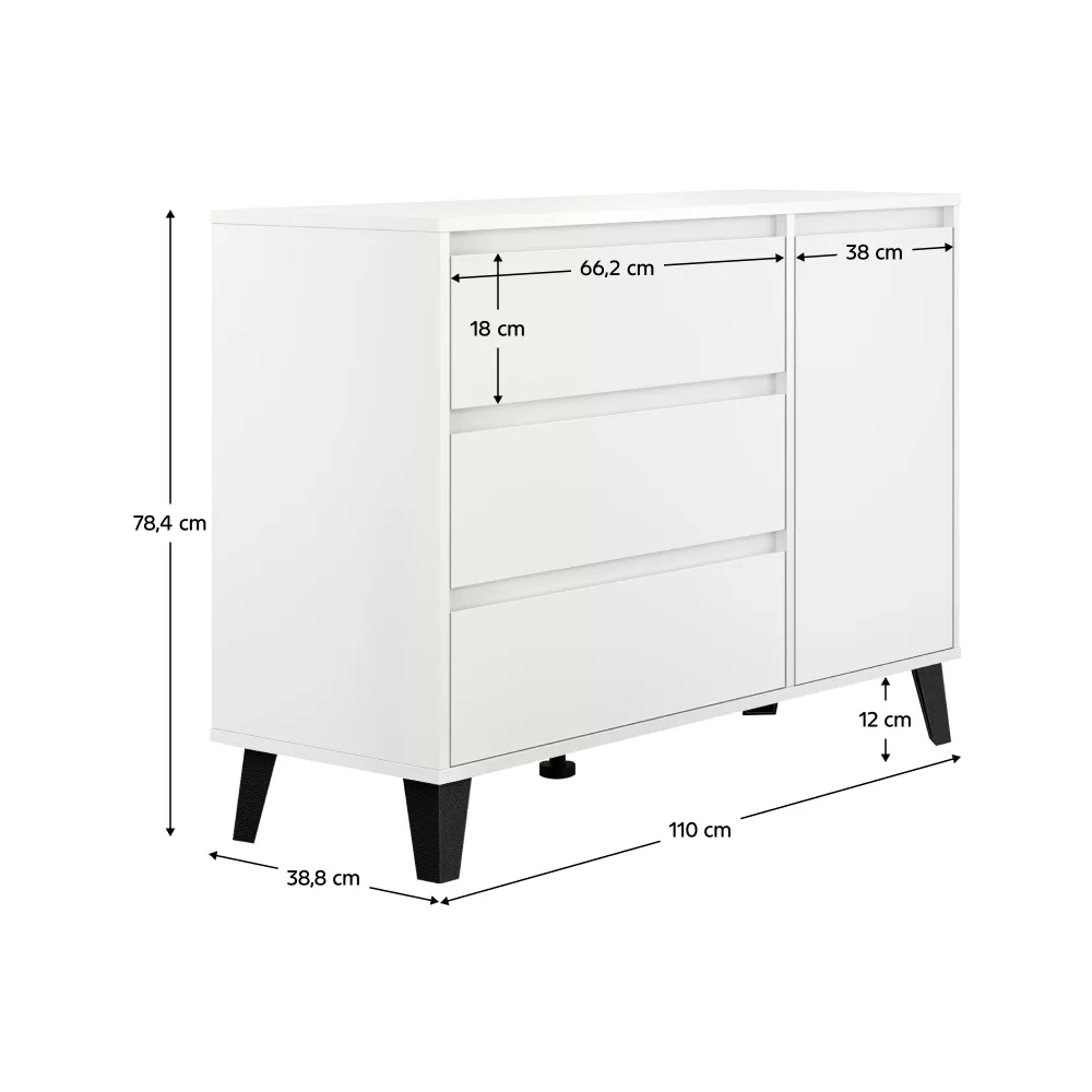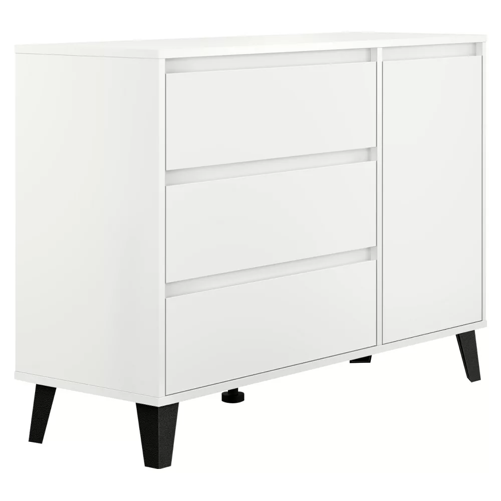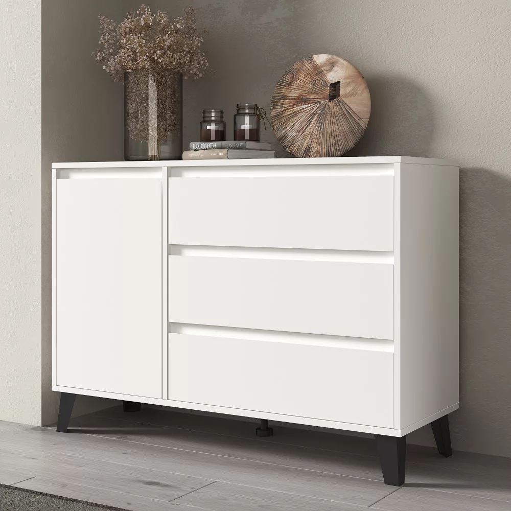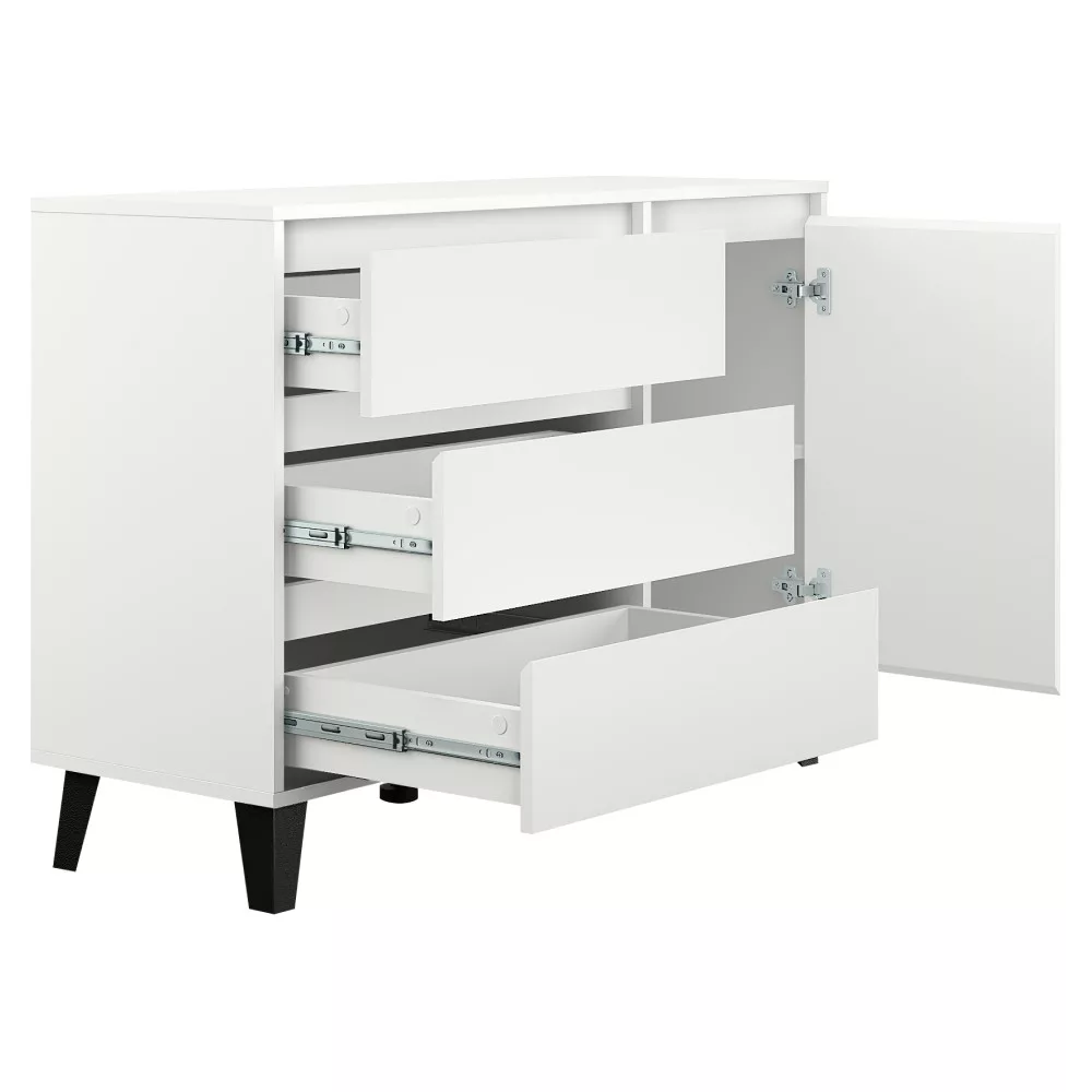 Ez a sokoldalú tároló szekrény bőséges helyet kínál a mindennapi tárgyaknak, így tökéletesen illeszkedik nappalik, hálószobák, de akár előszobák vagy étkezők berendezésébe is. A három tágas fiók és az egyetlen ajtó mögötti polcos rész gondoskodik a rendszerezett tárolásról. Ideális választás ruhás komódként is, de iratokat vagy egyéb személyes holmikat is elrejthetsz benne. A fiókokat és az ajtót az előlapokon kialakított finom bemélyedések segítségével nyithatod ki, ami hozzájárul a bútor letisztult megjelenéséhez.