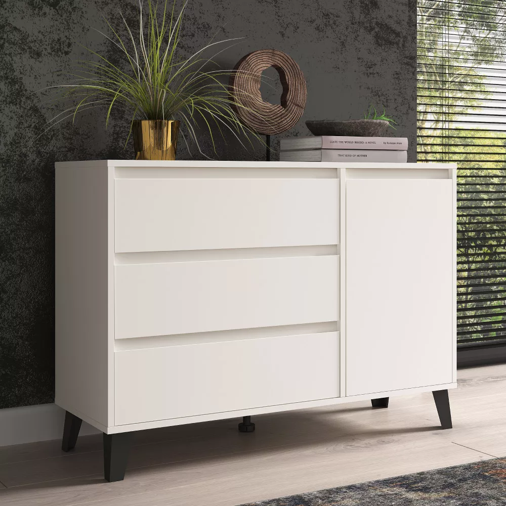 A rendezett és harmonikus otthon megteremtésekor kulcsfontosságú a megfelelő tárolóhely. Egy jól megválasztott komód nem csupán praktikus, de a szoba stílusát is meghatározza. Ha egy letisztult, mégis karakteres megoldást keresel, a BOGAN NEW termékcsalád komódja ideális választás lehet számodra. Időtlen, modern dizájnját a fehér szín és a minimalista, fogantyúk nélküli kialakítás adja, melyet a kontrasztos fekete lábak tesznek igazán stílusossá.