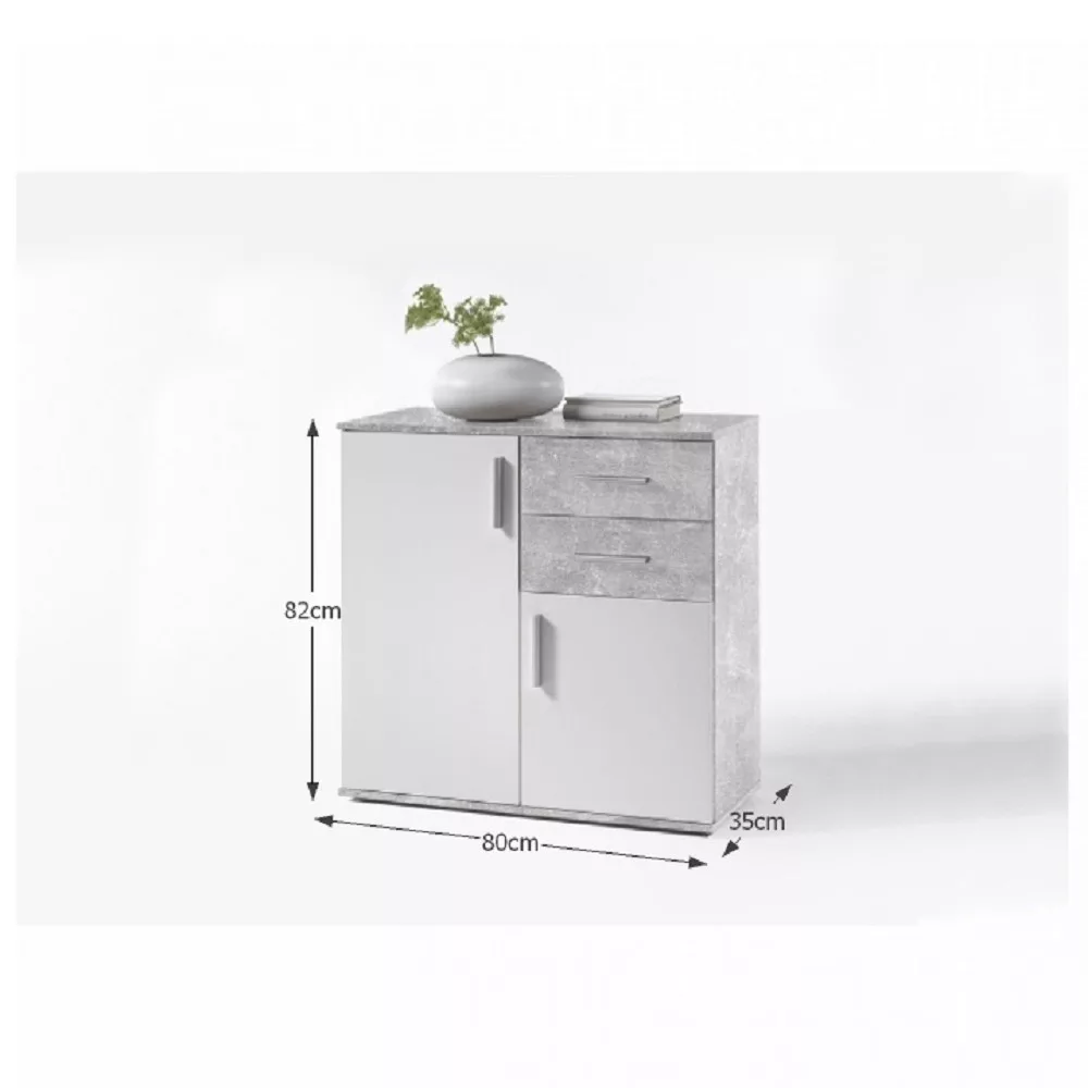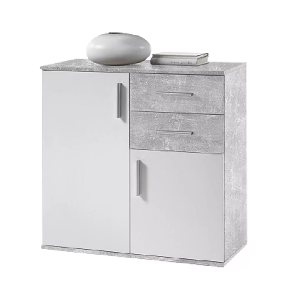Egy jól megválasztott komód nem csupán tárolóhelyet biztosít, hanem otthonod meghatározó dizájnelemévé is válhat. Ez a modern, beton/fehér színkombinációjú, kétajtós és kétfiókos komód tökéletes példája annak, hogyan találkozik a funkció az esztétikummal, segítve téged a rendezett és harmonikus élettér kialakításában.