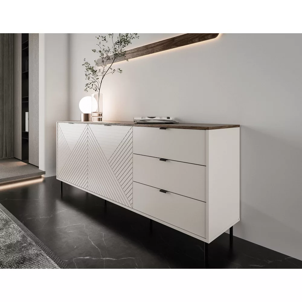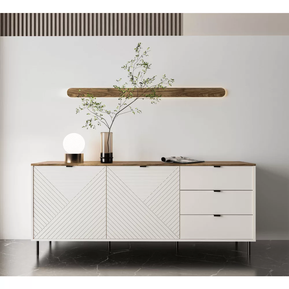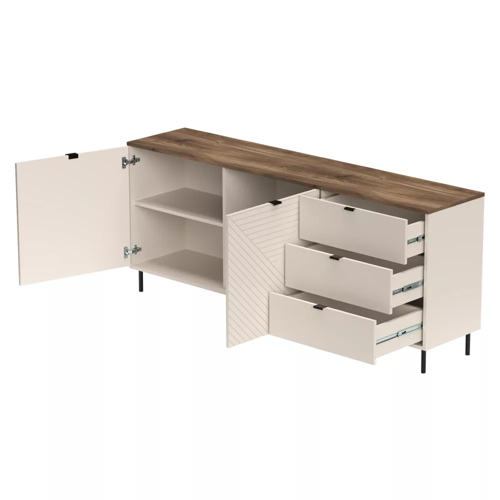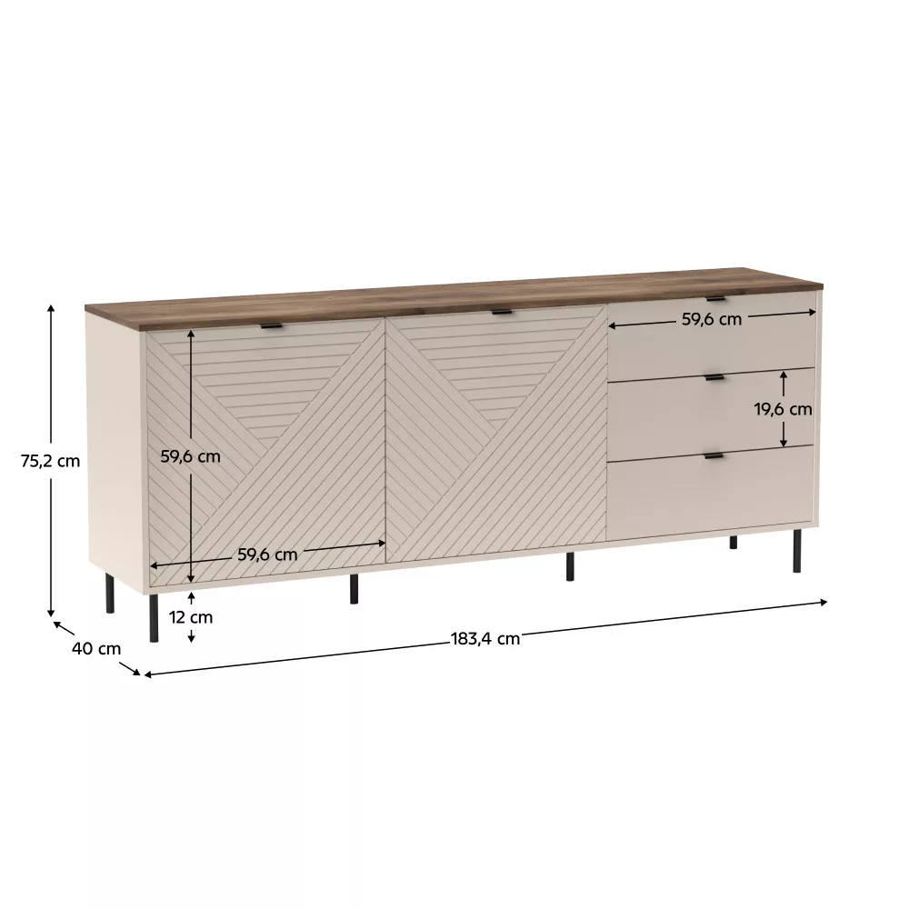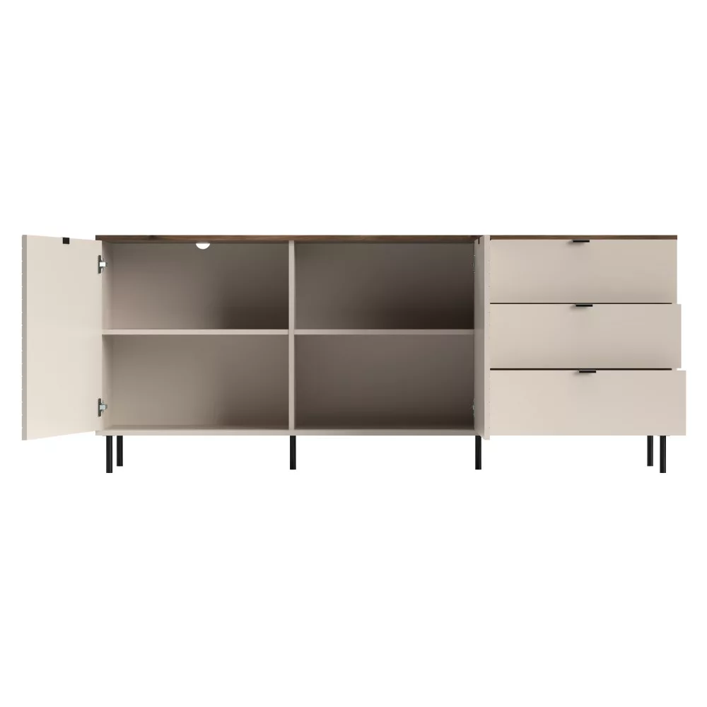 Ez a stílusos tároló szekrény a kasmír és a castello tölgy kifinomult színkombinációjával, valamint a kontrasztos fekete fém lábakkal és fogantyúkkal azonnal otthonod központi elemévé válik. A minőségi anyaghasználat – laminált DTD test, fóliázott MDF dekoratív ajtók és a mechanikai sérülésektől védő, strapabíró ABS élek – garantálja, hogy a bútor hosszú éveken át megőrzi szépségét. A modern dizájn letisztultságot és eleganciát visz a térbe, miközben praktikus tárolási lehetőségeket kínál.