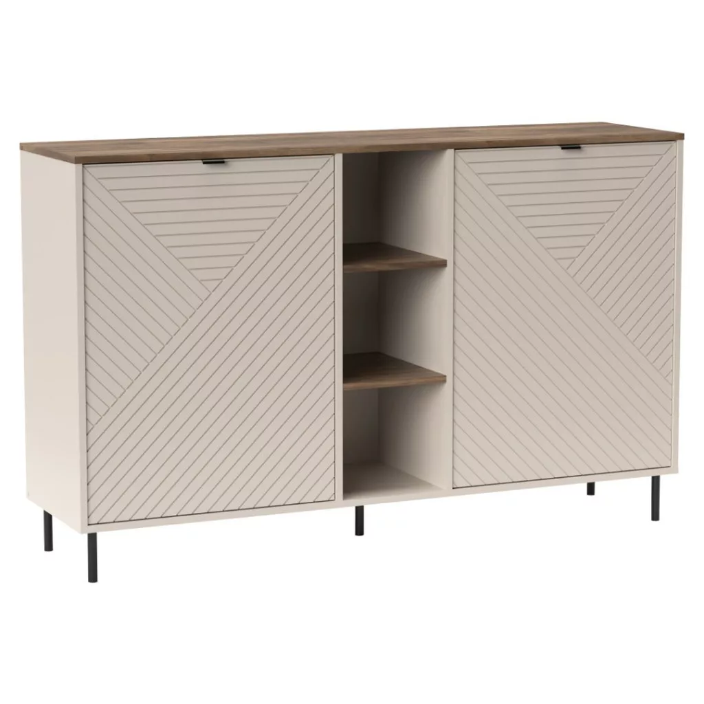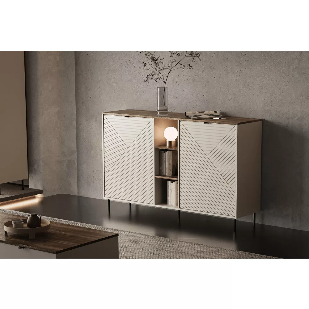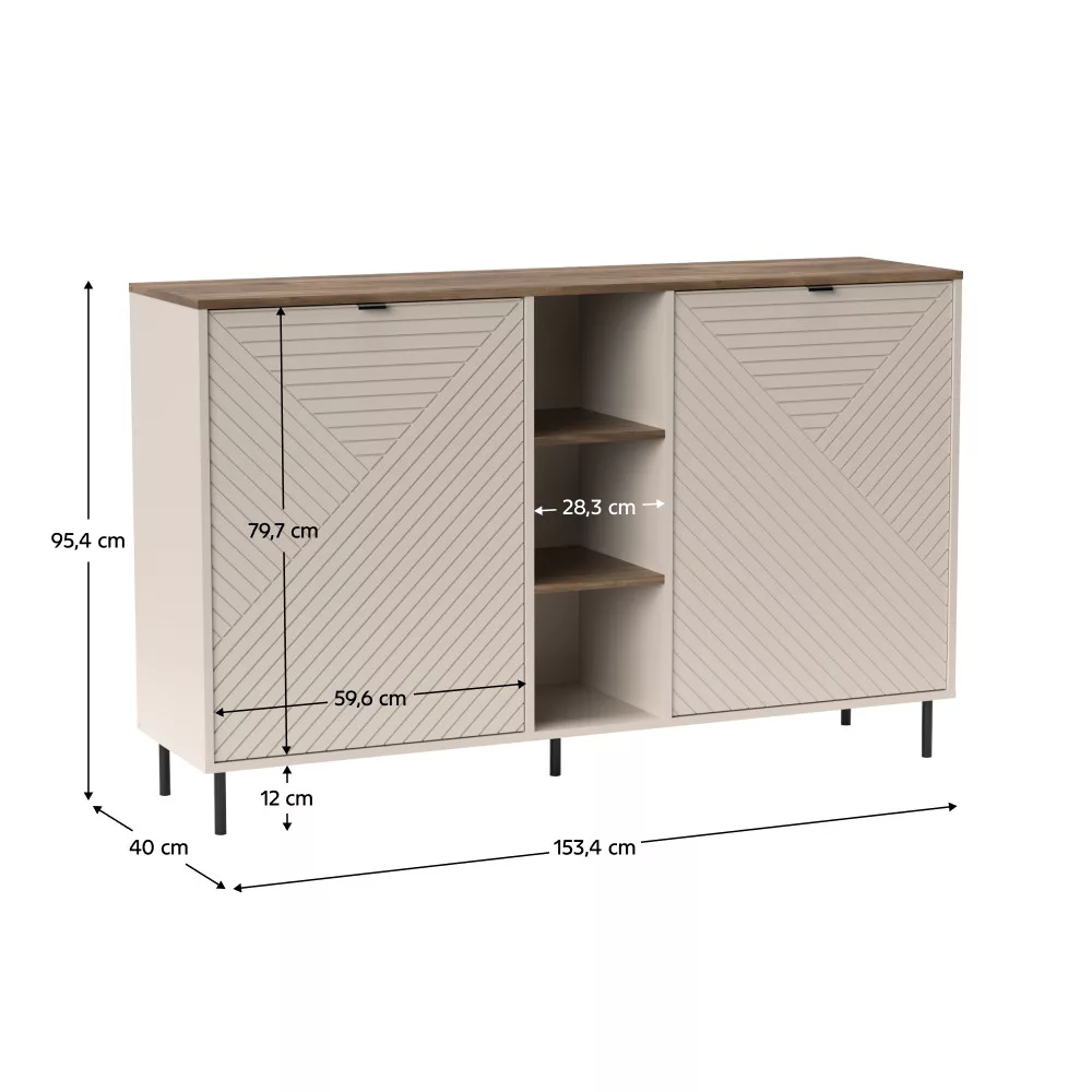 - Kialakítás: Kétajtós, két különálló szekrénnyel és egy nyitott tárolórésszel