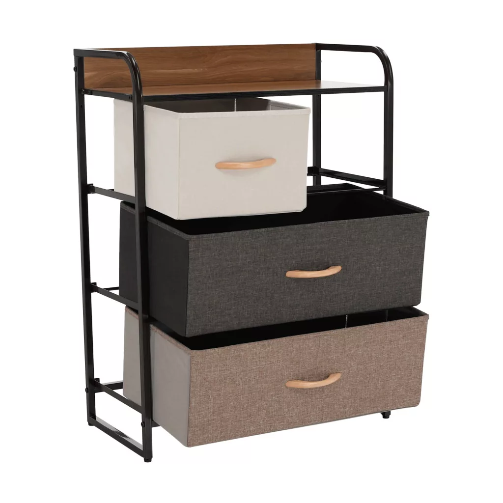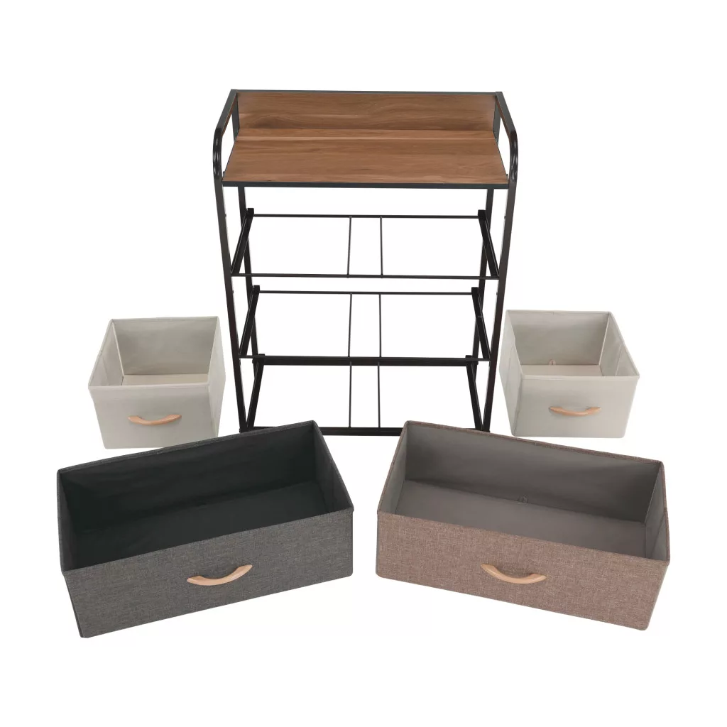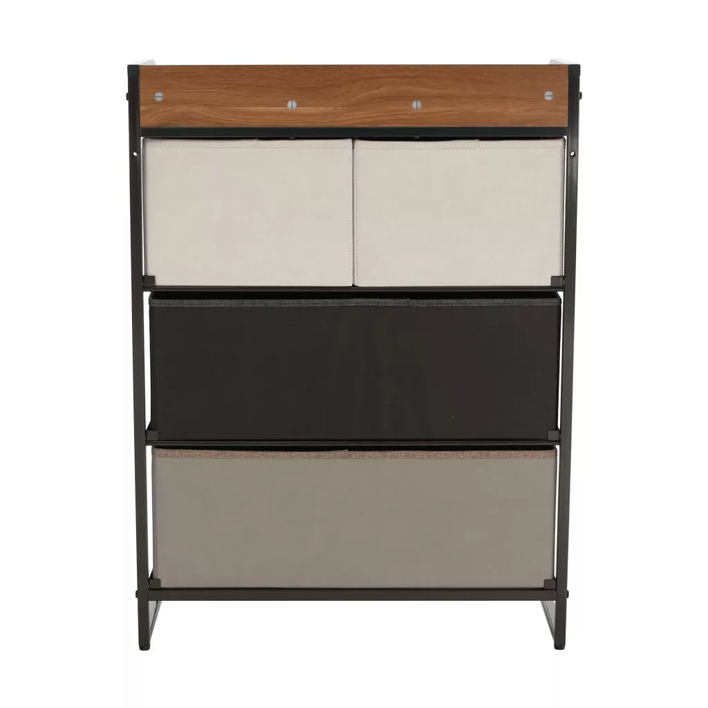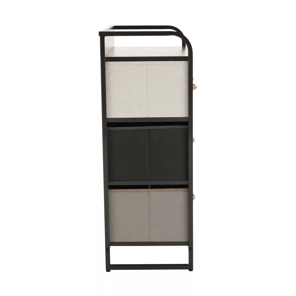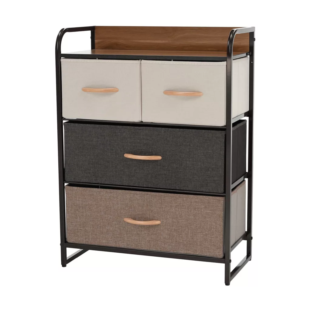Ez a komód nem csupán egy tárolóeszköz, hanem egy valódi stíluselem. A sötétbarna fém szerkezet stabil alapot biztosít a négy tágas, szövetből készült fióknak, amelyek bézs, világosbarna és sötétbarna árnyalatokban játszanak, egyedi dinamikát kölcsönözve a bútornak. A természetes fa fogantyúk és a fa mintázatú MDF felső lap melegséget és kifinomultságot sugároznak, tökéletes egyensúlyt teremtve az indusztriális és a természetes stílusjegyek között.