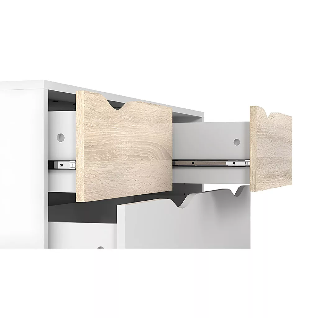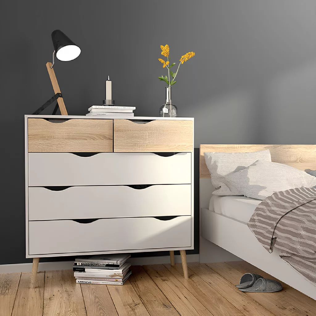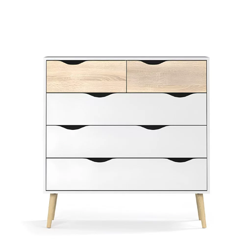Az OSLO fiókos szekrény tökéletes választás, ha a letisztult formavilágot és a praktikus kialakítást keresed. A laminált DTD (faforgácslap) alapanyag nem csupán esztétikus, de szilárdságot, tartósságot és ellenállóságot is biztosít. A modern fehér és a természetes hatású sonoma tölgy színkombinációja világos, barátságos atmoszférát teremt bármely helyiségben. Az öt tágas fiók bőséges helyet kínál ruháidnak, dokumentumaidnak vagy egyéb személyes tárgyaidnak, így ez a bútor ideális ruhás komód vagy sokoldalú tároló szekrény is egyben.