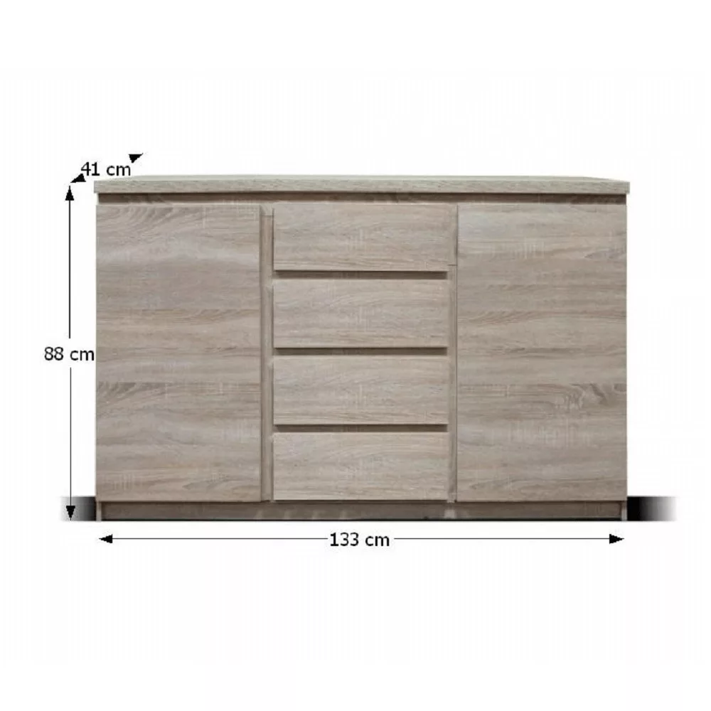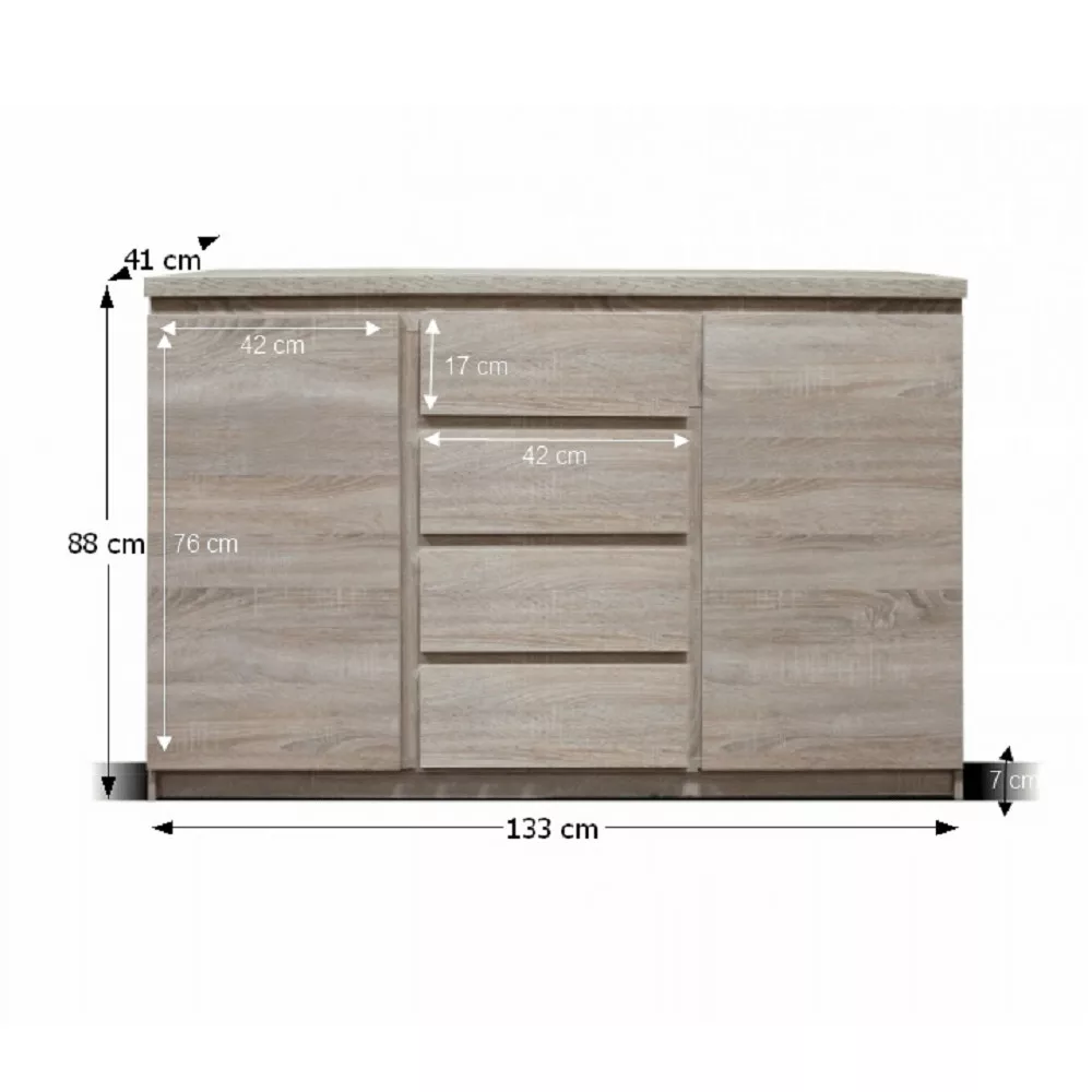 A minőség és a tartósság alapvető szempont volt a tervezés során. A komód alapját a nagy teherbírású, laminált DTD lapok adják, amelyek garantálják a bútor szilárdságát, rugalmasságát és ellenállóképességét a mindennapi használat során. A korpusz 16 mm-es, míg a felső lemez masszív, 25 mm-es vastagsága a robusztus és prémium érzetet erősíti. A gondos megmunkálásról tanúskodnak a kiváló minőségű ABS élek, amelyek megvédik a bútort a sérülésektől és biztosítják, hogy színe az évek múltán se fakuljon meg.