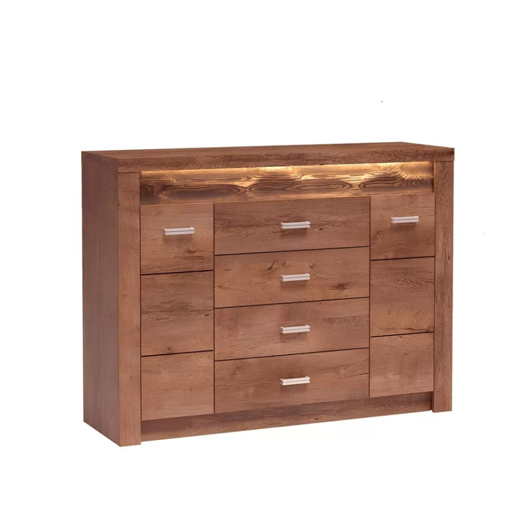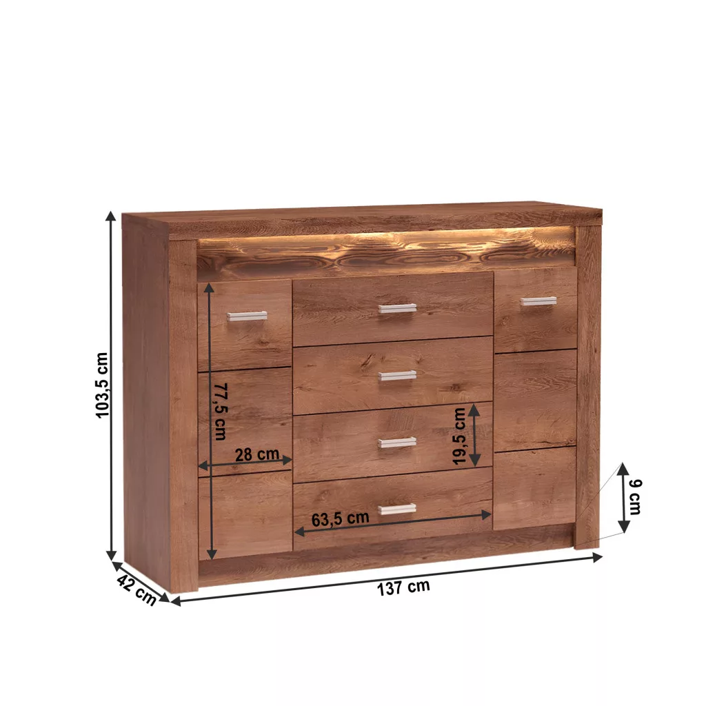 A szépség mellett a tartósság és a magas kihasználhatóság is központi szerepet kapott. A minőségi laminált DTD lapok és az ütésálló ABS élek garantálják, hogy ez a fiókos szekrény hosszú éveken át megbízható társad lesz a mindennapokban. Ideális választás ruhás komódként a hálószobába, de elegáns tároló szekrényként a nappaliban vagy az étkezőben is megállja a helyét, variálhatóságának köszönhetően.