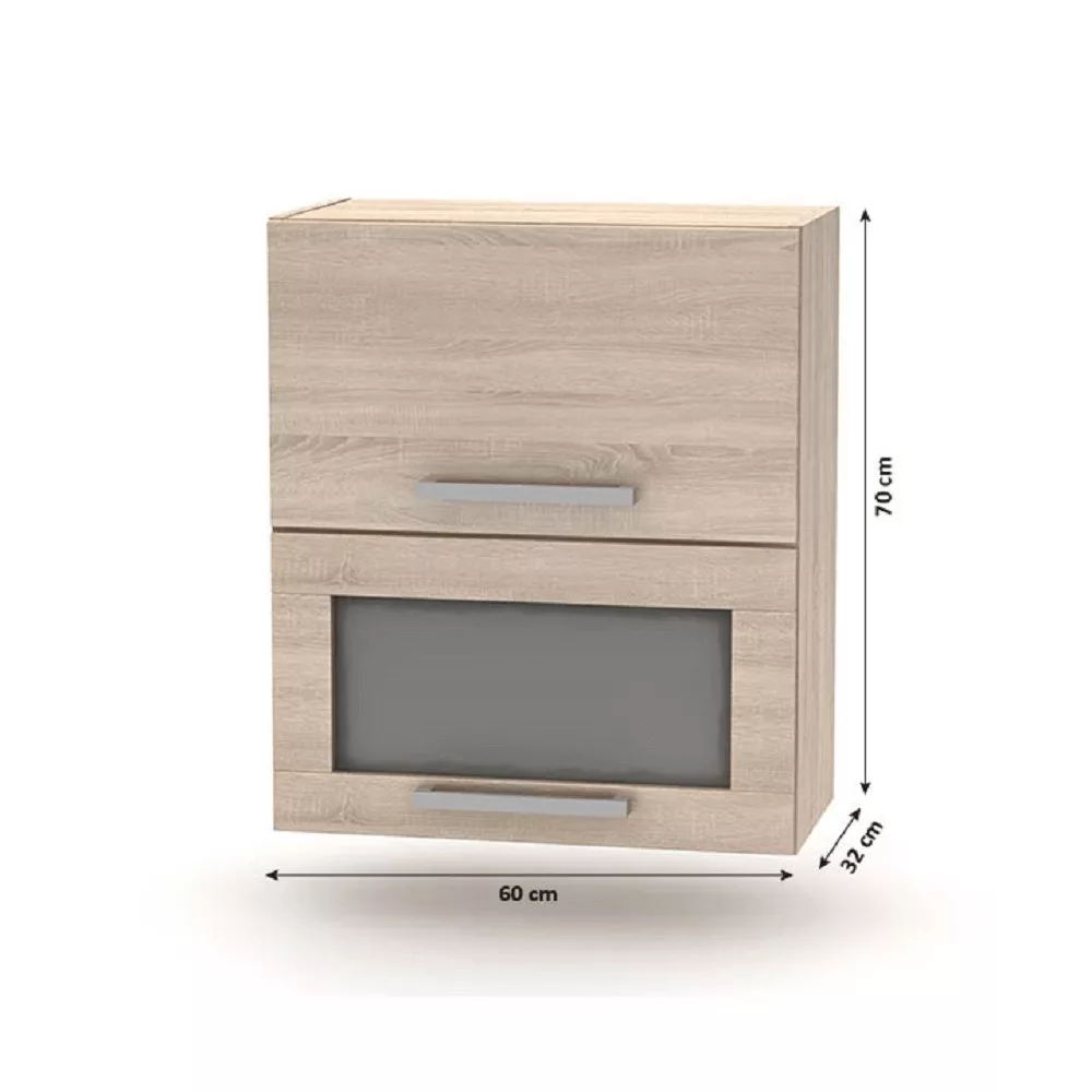 - Üveges szekrény (009-OH): 60x32x70 cm, felfelé billenő üveges ajtókkal és nyitott polccal