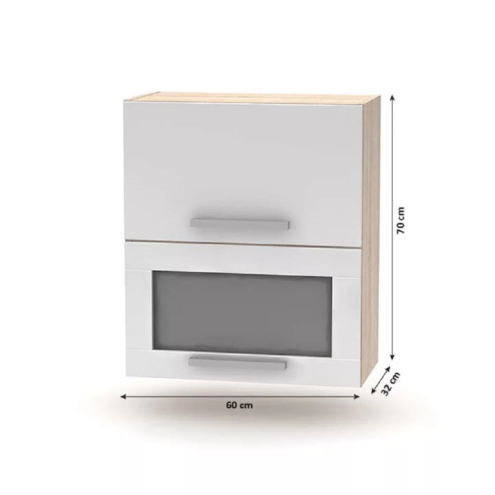 - Az elegáns, két üveges ajtóval ellátott 2DV NOPL-009-OH szekrény szintén felfelé billenő mechanizmussal nyílik, alatta pedig egy nyitott polc kínál helyet a gyakran használt fűszereknek vagy dísztárgyaknak.