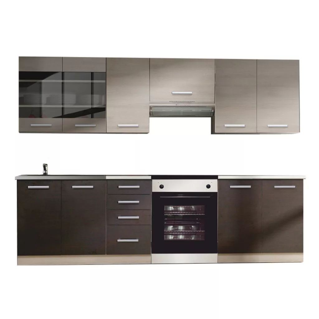 - A csomag tartalma: Felső és alsó szekrények ajtóval, felső üveges szekrény, négy fiók, munkalap (a mosogatószekrény kivételével), alsó takaróléc