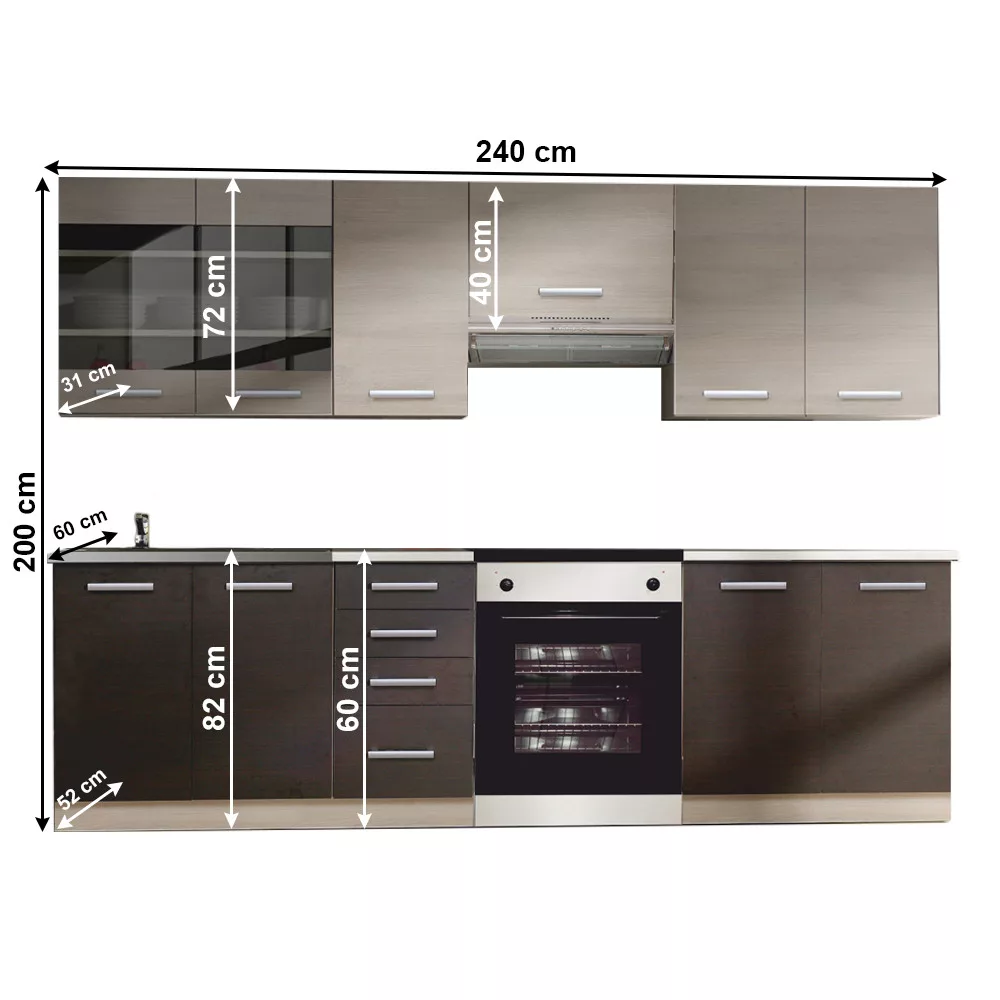 - Felső szekrények magassága: 72 cm (a páraelszívó szekrény magassága 40 cm)