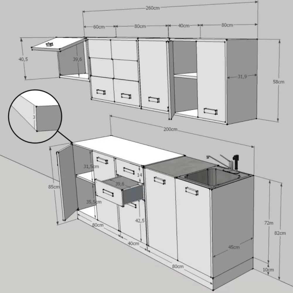 - Alsó konyhai elemek: 1 db 40 cm-es fiókos szekrény, 1 db 80 cm-es mosogató szekrény, 1 db 80 cm-es kétajtós szekrény