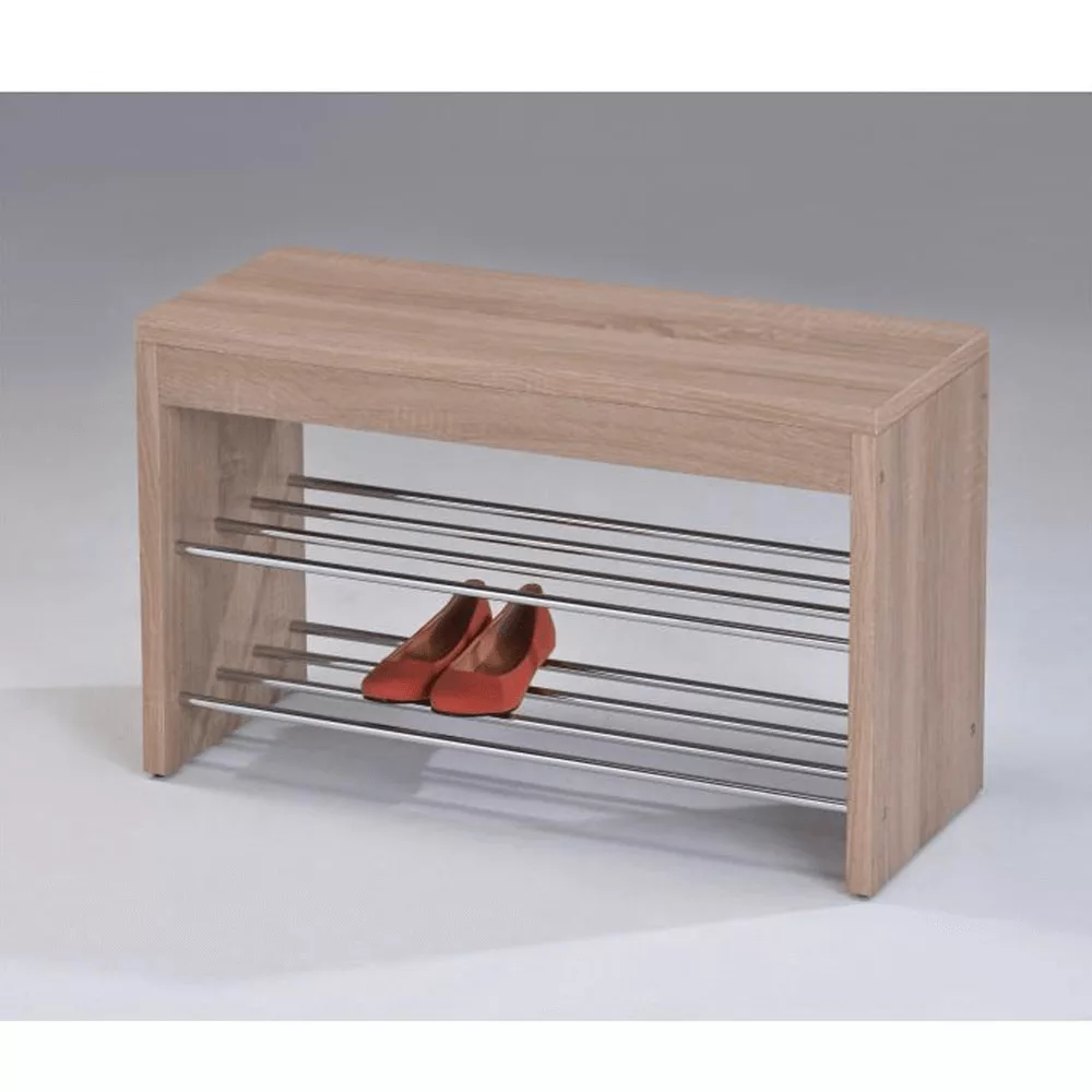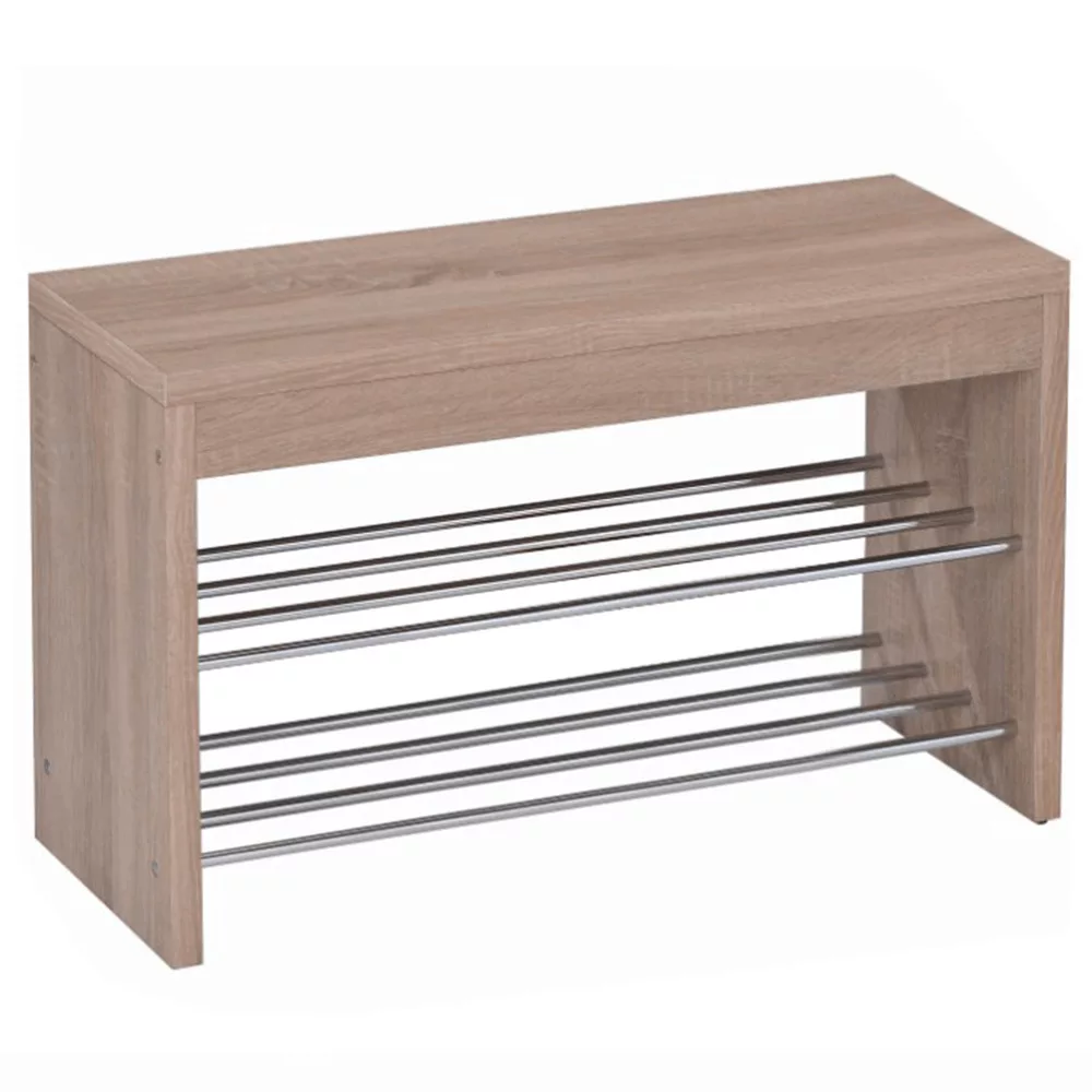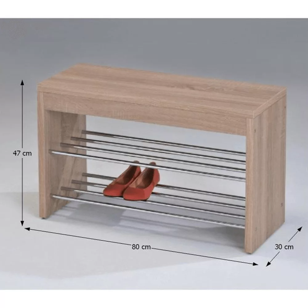 Egy rendezett előszoba nemcsak esztétikailag kellemes látvány, hanem a nyugodt otthoni légkör alapja is. Fedezd fel ezt a multifunkciós cipőtartó padot, amely a sonoma tölgy melegségét a króm modern eleganciájával ötvözi. A 80x30x47 cm-es méretével ideális előszobai cipőtároló, amely nem foglal sok helyet, mégis bőséges tárolási lehetőséget kínál a két fém polc segítségével. Az erős, 25 mm vastagságú MDF ülőfelület teherbírása eléri a 100 kg-ot, így kényelmesen használhatod cipőfelvétel közben is.