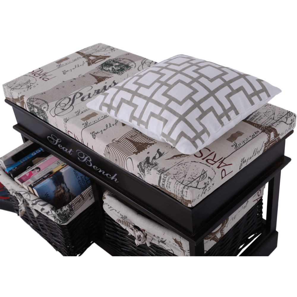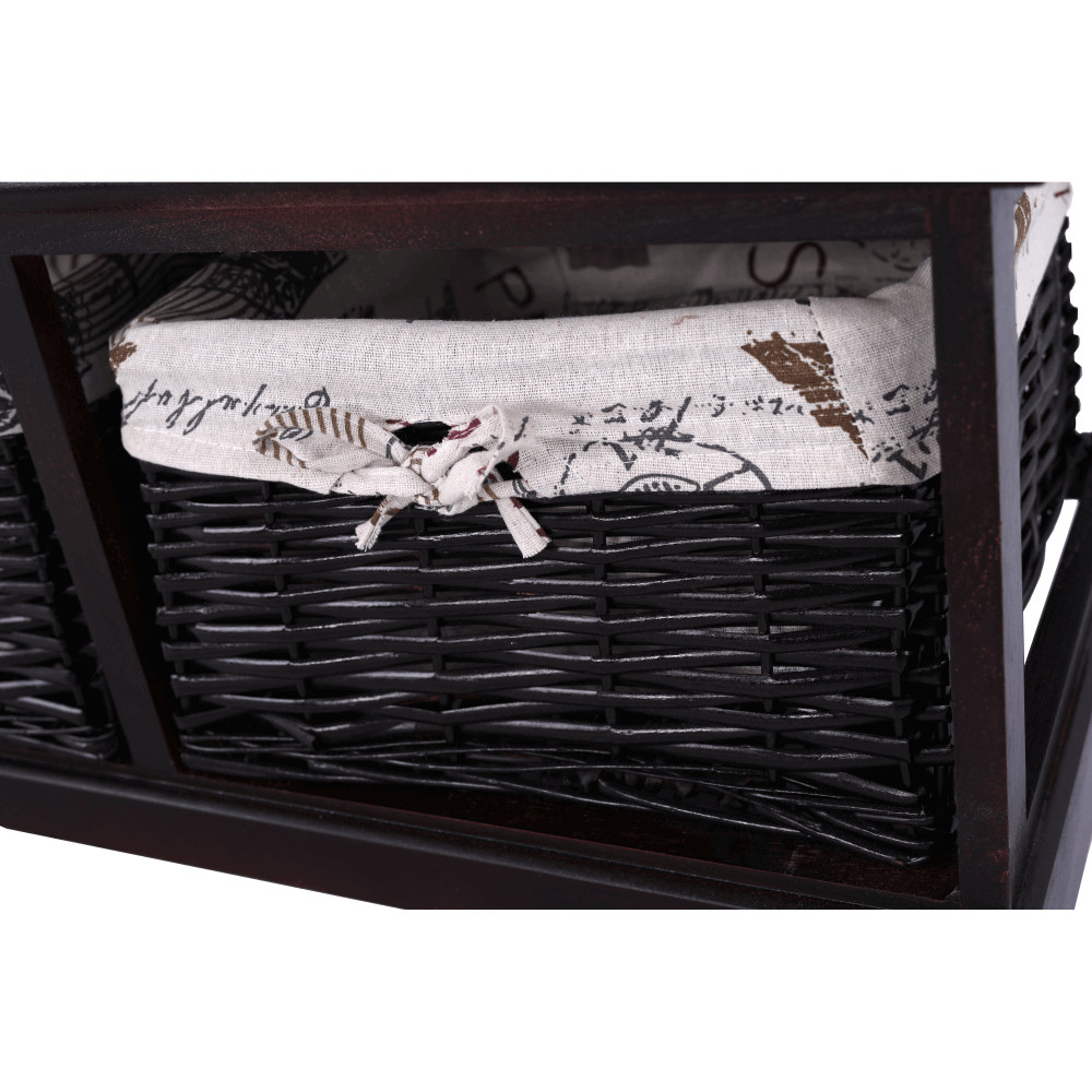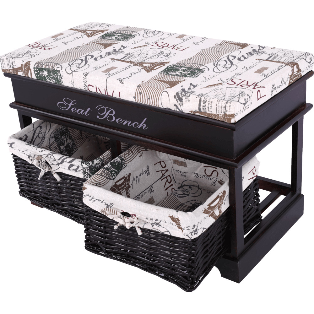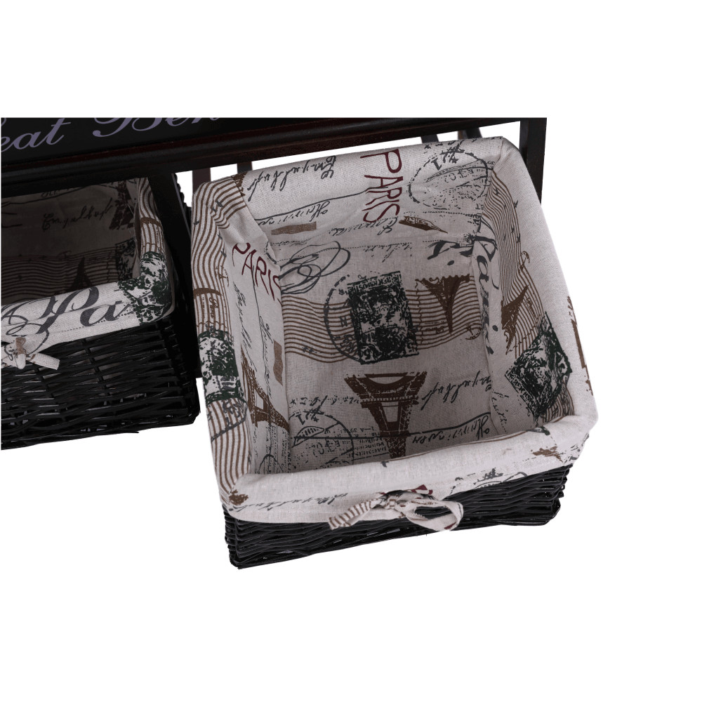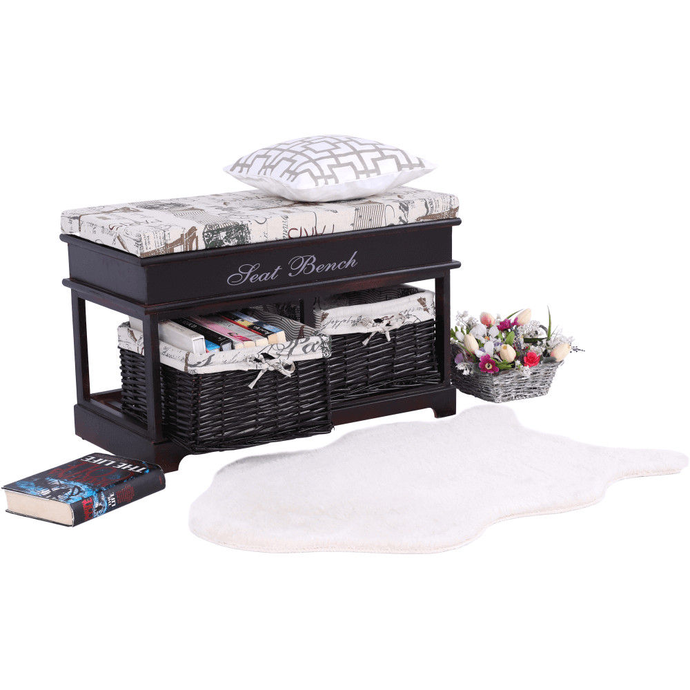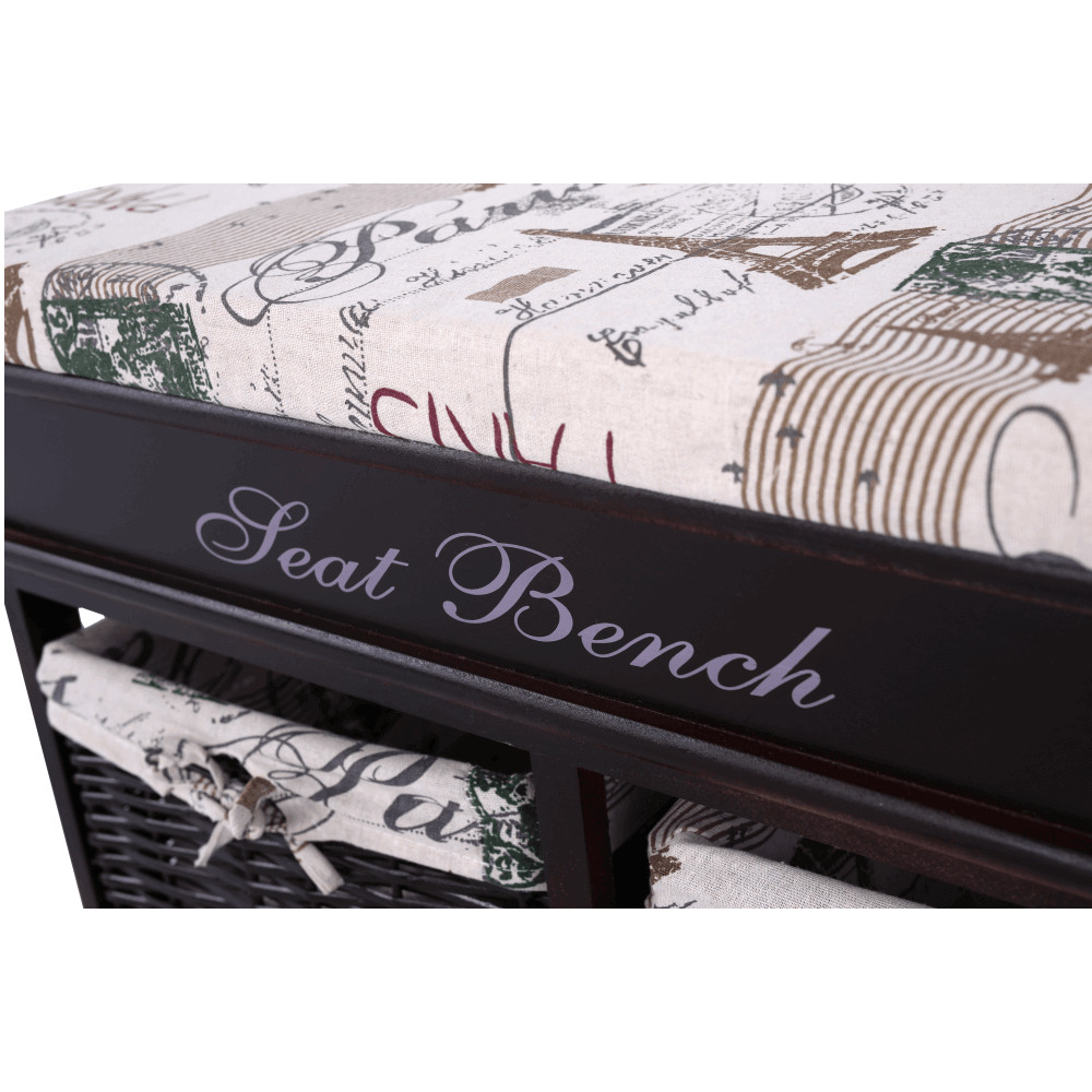 A SEAT BENCH 3 pad pontosan ilyen kettős funkciót tölt be. Ez a sötétbarna fából készült, romantikus stílusú ülőke azonnal magára vonzza a tekintetet eredeti külsejével. Nem csupán egy kényelmes helyet biztosít a cipőfelvételhez, hanem a két praktikus, vesszőből készült fiókjának köszönhetően diszkrét tárolási megoldást is kínál sálak, kesztyűk vagy egyéb apróságok számára. A díszes „Seat Bench” felirat és a hozzá tartozó mintás párna tovább erősítik a darab egyedi, barátságos kisugárzását.