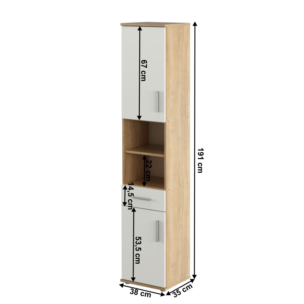 Ez a modern és sokoldalú **fürdőszobai tároló** átgondolt tervezésének köszönhetően segít rendet tartani, hogy minden szükséges kellék kéznél legyen, mégis rejtve maradjon a szem elől. A gondosan megtervezett belső elrendezés – a polcos, kétajtós rész, a praktikus fiók és a nyitott tároló – lehetővé teszi a törölközők, kozmetikumok és egyéb fürdőszobai kiegészítők logikus és esztétikus elhelyezését. Univerzális kialakítása révén szinte bármilyen stílusú fürdőhelyiség bútorai közé tökéletesen beilleszthető, hozzájárulva a tiszta és átlátható összképhez.