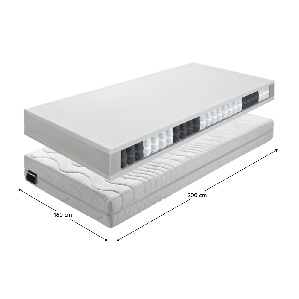 A matrac lelke a pontelasztikus táskarugós rendszer, ahol minden egyes, magas minőségű drótból készült rugó külön-külön, egy-egy kis textilzsákban mozog. Ez lehetővé teszi, hogy a derékalj csak ott és csak olyan mértékben süllyedjen be, ahol a tested nyomást gyakorol rá. Ezzel biztosítja a gerinc természetes, egyenes vonalának megőrzését alvás közben, függetlenül attól, hogy pároddal osztod meg az ágyat. A rétegeket a legújabb HOTMELT technológiával, oldószermentes, környezetbarát eljárással rögzítettük, ami garantálja a tartósságot és a stabil szerkezetet.