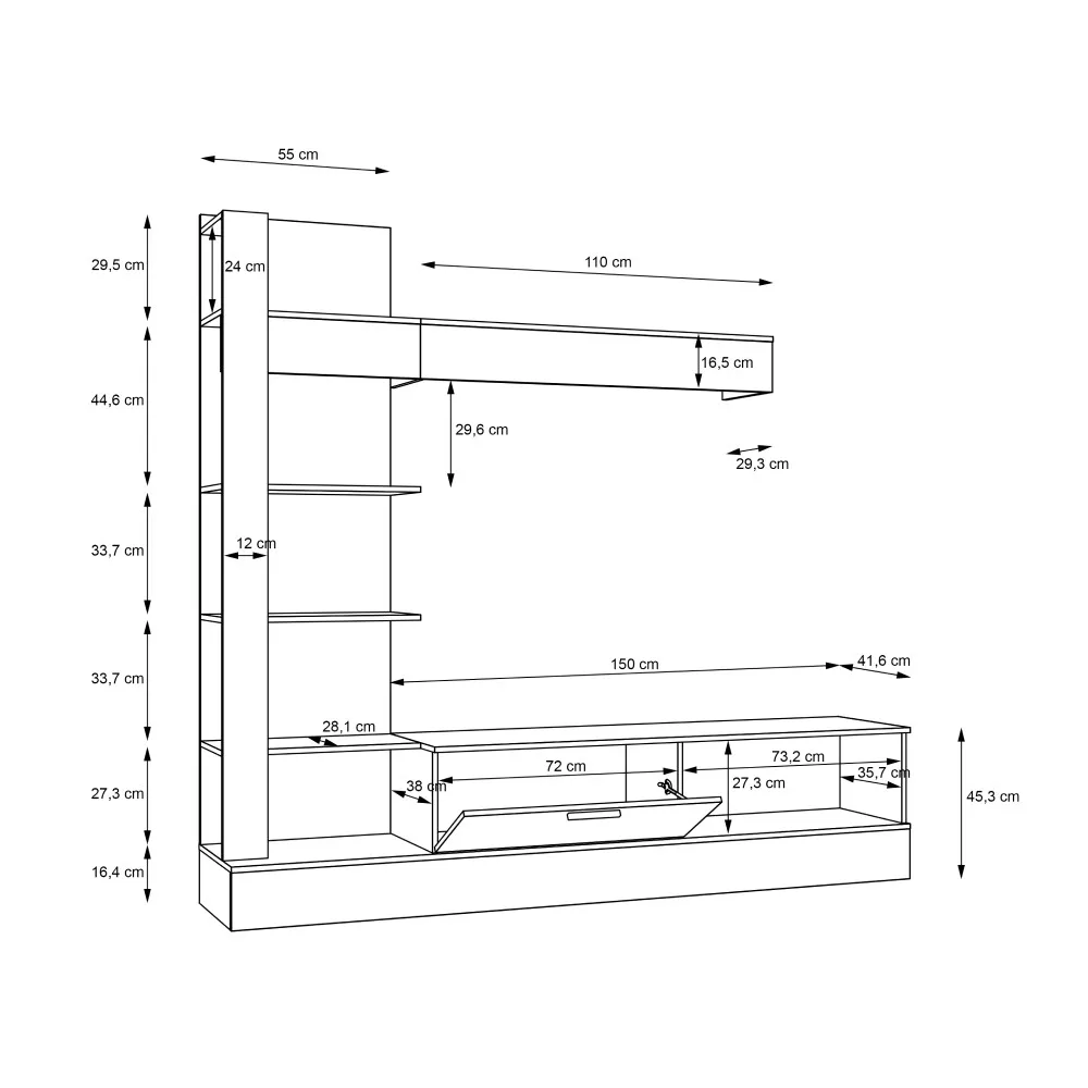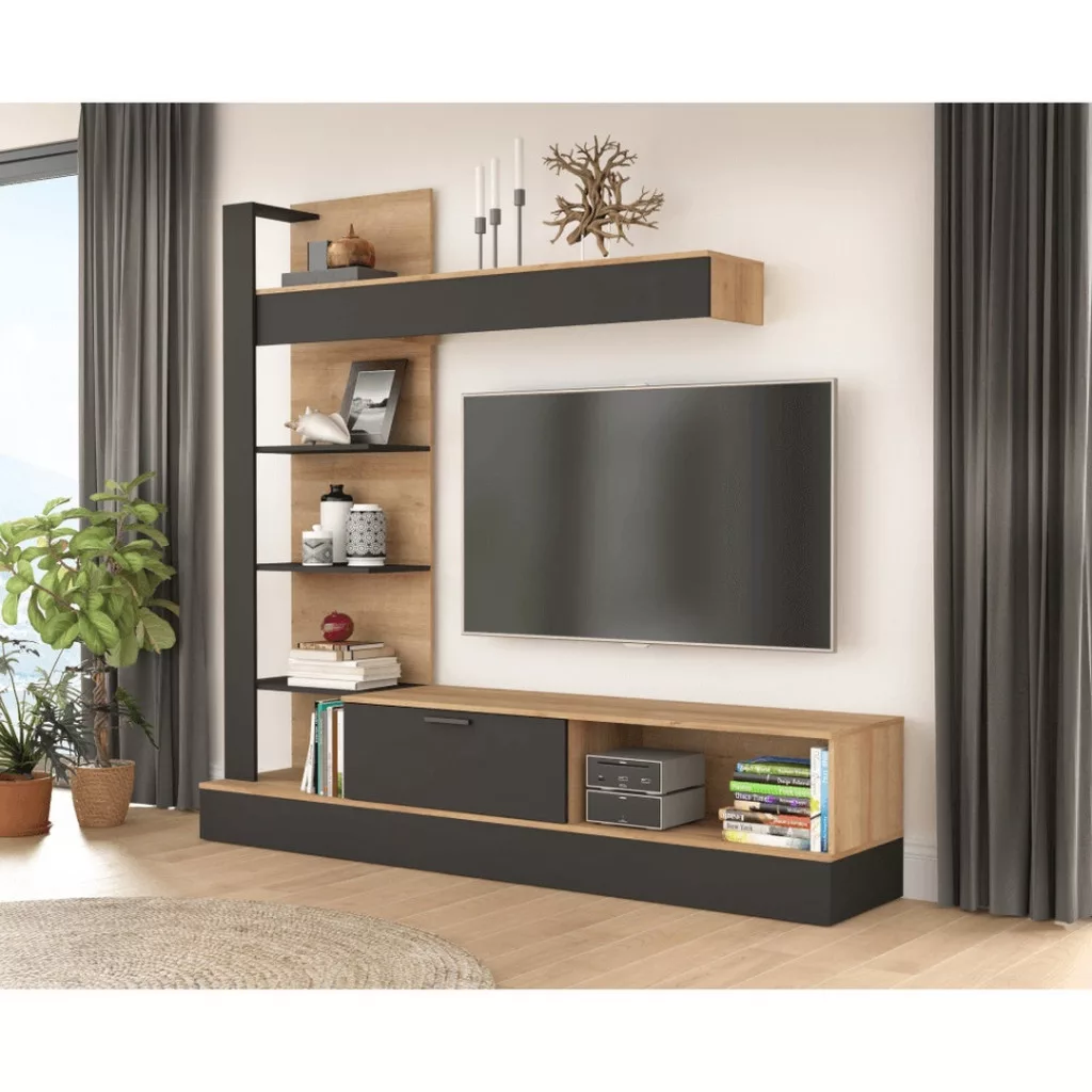 A szett központi eleme a praktikus TV asztal, amely egy rejtett, billentős szekrényből és egy nyitott tárhelyből áll. A zárt rész diszkréten elrejti a szem elől a kevésbé dekoratív eszközöket, míg a nyitott polc ideális a médialejátszók vagy konzolok számára. A szekrényajtó egy stílusos, fekete műanyag fogantyúval nyílik. A fali panel részét képező nyitott polcokon pedig büszkén kiállíthatod kedvenc könyveidet, dísztárgyaidat vagy a legszebb családi fotókat, személyessé téve a teret.