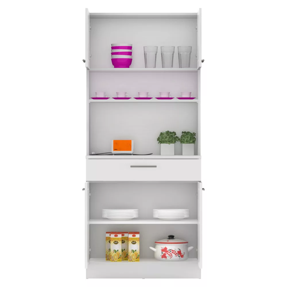 - Kialakítás: Négyajtós, egyfiókos, polcos