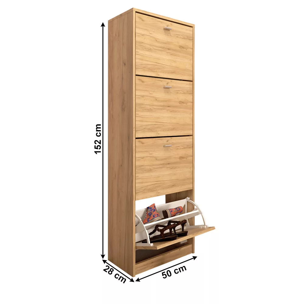 A VIVAT NEW TYP 3 négyrészes cipősszekrény elegáns és praktikus megoldást kínál erre a problémára. Minőségi, laminált DTD faforgácslapból készült, a divatos és meleg hatású artisan tölgy színváltozatban. Karcsú kialakításának és négy billenő rakodóterének köszönhetően diszkréten simul bele bármilyen enteriőrbe, azonnali rendet teremtve.
