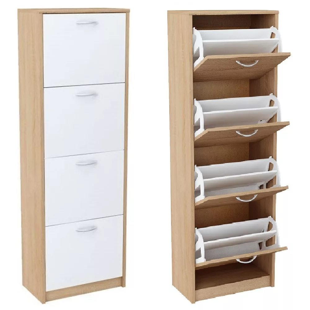 A négy, praktikusan billenőajtós rakodótérben kényelmesen elférnek a kisebb és nagyobb cipők egyaránt, így végre búcsút inthetsz a padlón heverő lábbeliknek. Az egyszerű, letisztult dizájn nemcsak a cipők tárolására teszi alkalmassá ezt a bútordarabot, amely elegánsabb megoldás egy nyitott cipőspolcnál, hanem a szekrény tetején a mindennapi apróságok, például kulcsok vagy kesztyűk is helyet kaphatnak. Nyerd vissza a teret a bejáratnál, és élvezd a rendezettség nyújtotta nyugalmat minden nap.