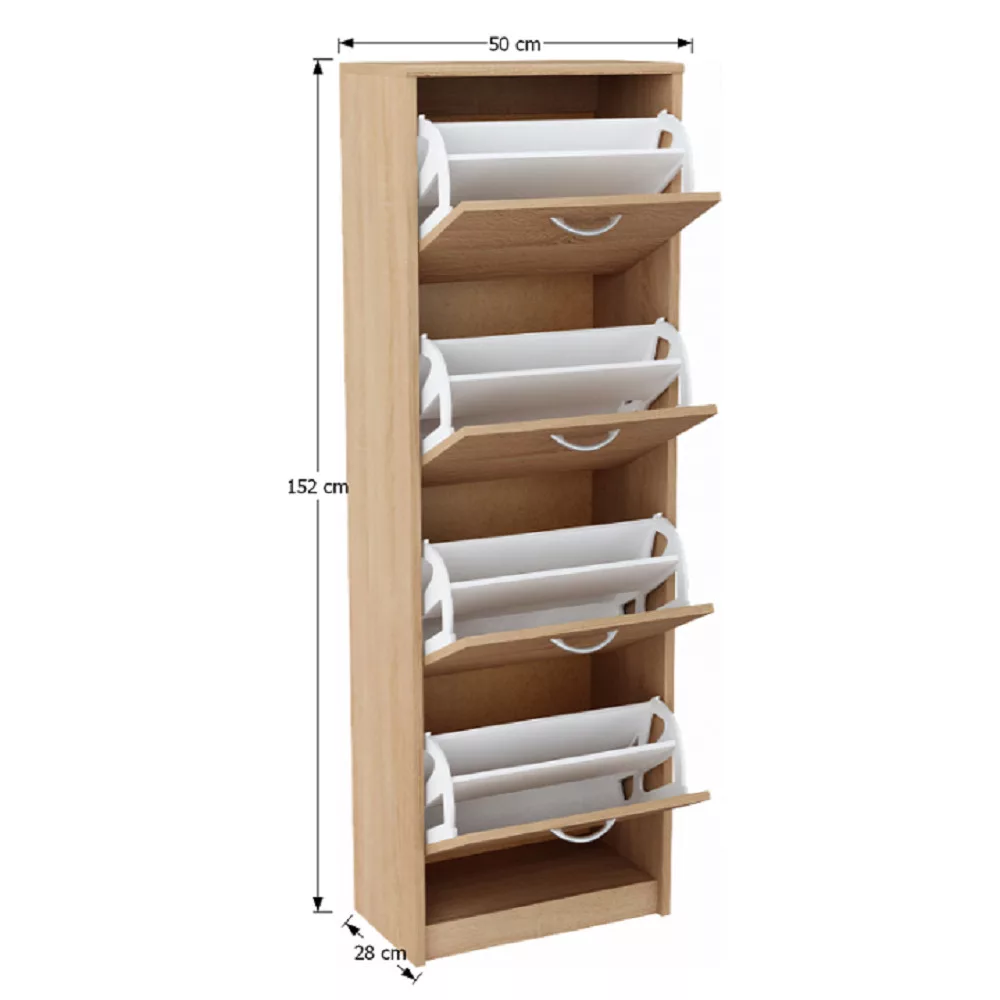 Ismerd meg a VIVAT NEW TYP 3 négyrészes cipősszekrényt, amely a modern dizájnt a maximális praktikummal ötvözi. Minőségi, 16 mm vastagságú laminált DTD faforgácslapból készült, a letisztult tölgy sonoma és fehér színkombináció pedig lehetővé teszi, hogy szinte bármilyen enteriőrbe könnyedén beilleszkedjen. Karcsú kialakításának köszönhetően ez az elegáns cipős állvány még a szűkebb előterekben is optimális helykihasználást biztosít, anélkül, hogy elvenné a teret.