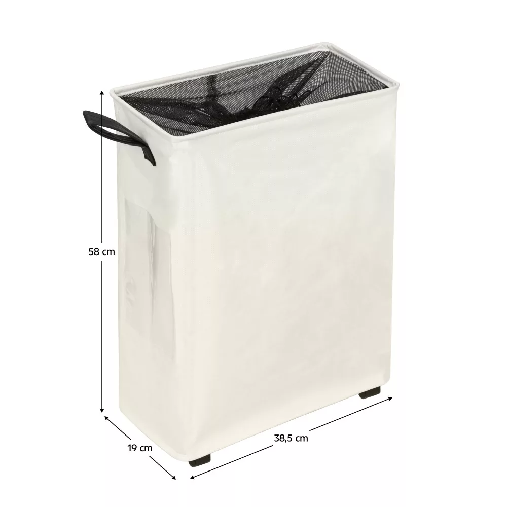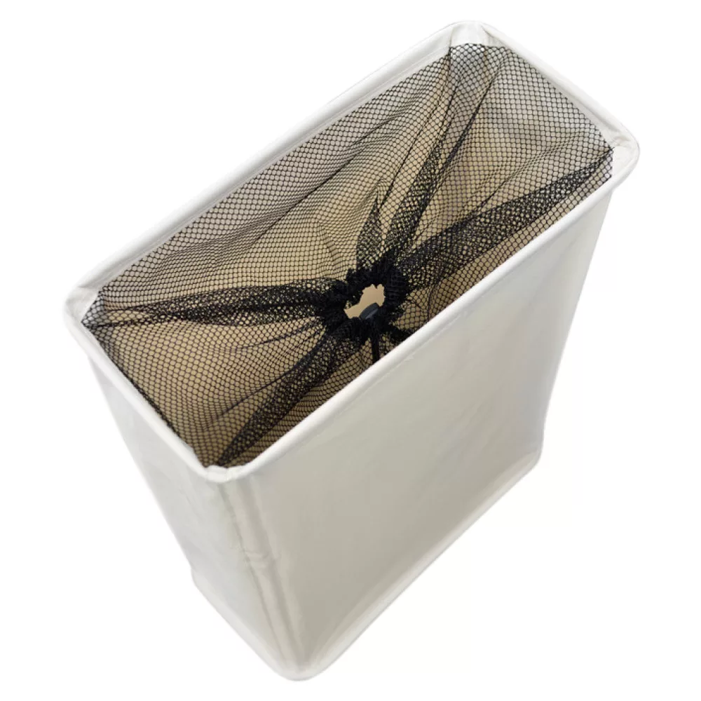 Ez a praktikus szennyesgyűjtő nem csupán egy tárolóeszköz, hanem egy átgondolt megoldás, amely megkönnyíti a mindennapokat. Bár nem egy klasszikus fonott szennyestartó, modern textil anyaga és letisztult formavilága kortárs eleganciát visz a térbe.