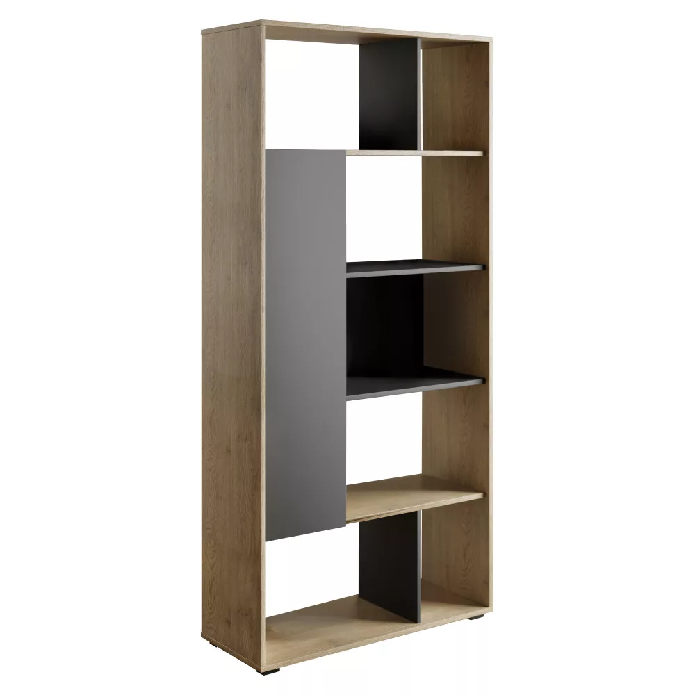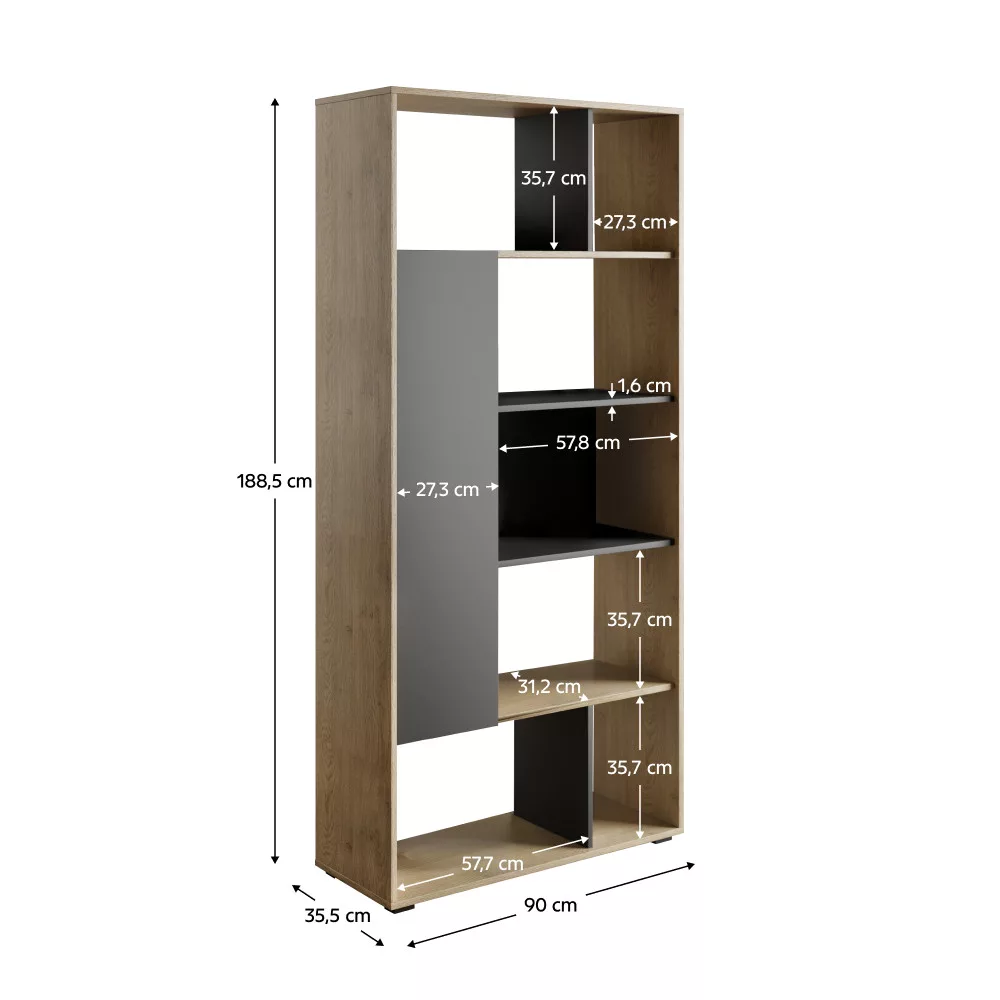 A nyitott tárolóhelyek tágas és átlátható felületet biztosítanak könyveid, legkedvesebb dekorációid vagy akár a munkádhoz szükséges dokumentumok számára. Többfunkciós jellegének köszönhetően ez a bútordarab tökéletes kiegészítője lehet az irodának, a nappalinak vagy a dolgozószobának, ahol egy megbízható tároló állvány rendet teremt a mindennapokban. Letisztult vonalvezetése és a meleg fa hatású és modern antracit színek kontrasztja eleganciát visz bármelyik helyiségbe.
