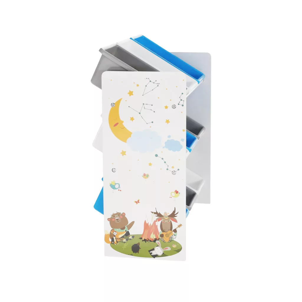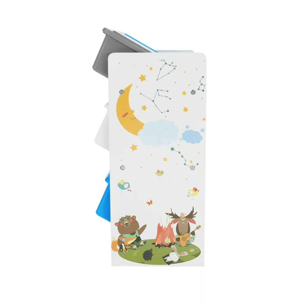 A stabil, laminált forgácslapból készült oldalak vidám mintája kíváncsiságot ébreszt, míg a strapabíró fém rudakon elhelyezett műanyag tárolók gondoskodnak a játékok biztonságos elhelyezéséről. Ez a bútordarab tökéletesen illeszkedik bármilyen gyerekszoba berendezés vagy akár bababútor mellé, játékos, mégis praktikus kiegészítőként.