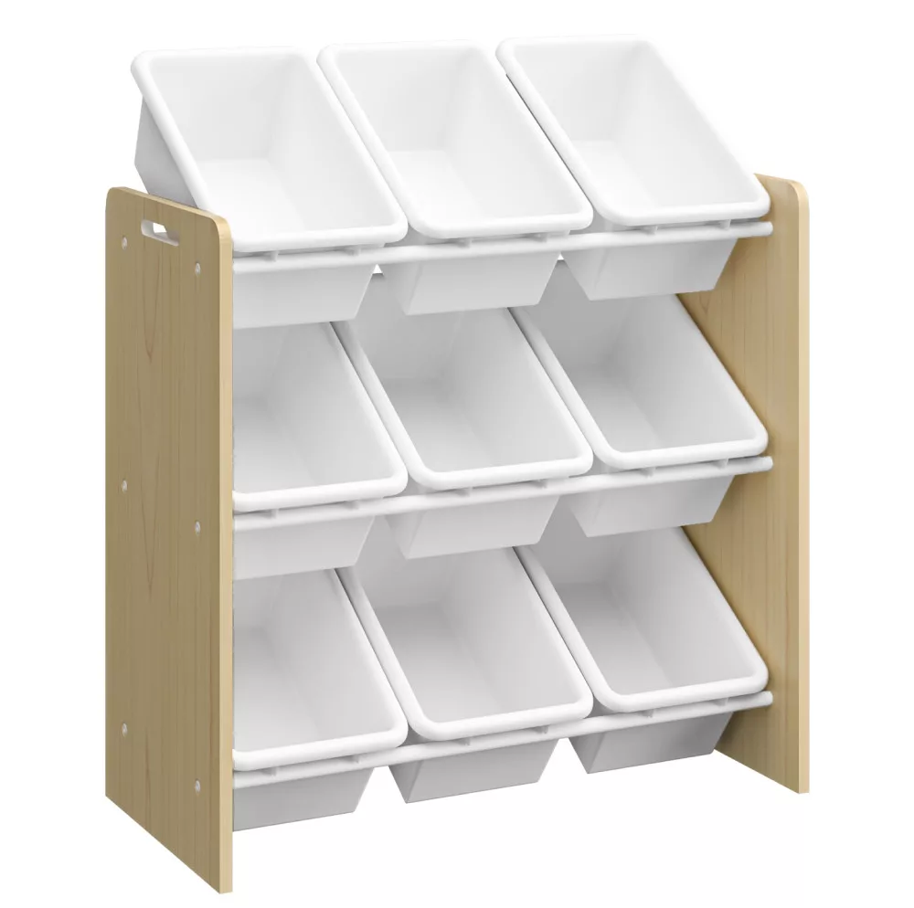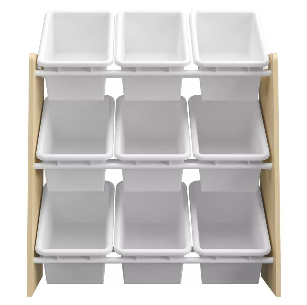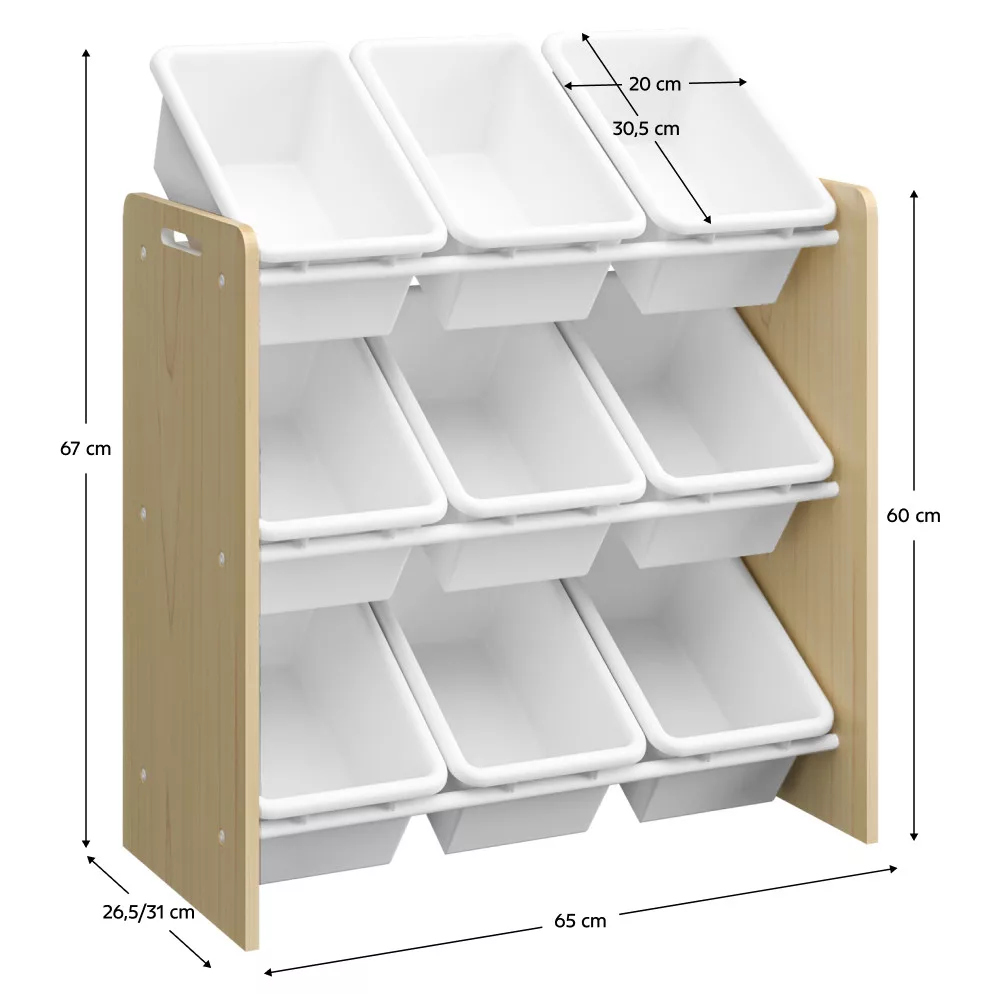 A BOIS játéktároló polc egy olyan funkcionális és stílusos megoldás, amely tökéletesen illeszkedik a modern gyerekszoba berendezés világába. A minőségi MDF váz természetes fa színével meleg, barátságos hangulatot teremt, míg a három szinten elhelyezett 9 darab, semleges fehér színű műanyag doboz letisztult és időtálló megjelenést kölcsönöz. Kialakításának köszönhetően kiválóan alkalmas kisebb helyiségekbe is, ahol minden négyzetcentiméter számít. A dobozokat praktikus fémrudak rögzítik, amelyek megakadályozzák azok véletlen kicsúszását, ugyanakkor lehetővé teszik, hogy a gyermek is könnyedén kivehesse és visszatehesse őket. Az oldalsó kivágások a polcállvány mozgatását és áthelyezését teszik egyszerűvé.