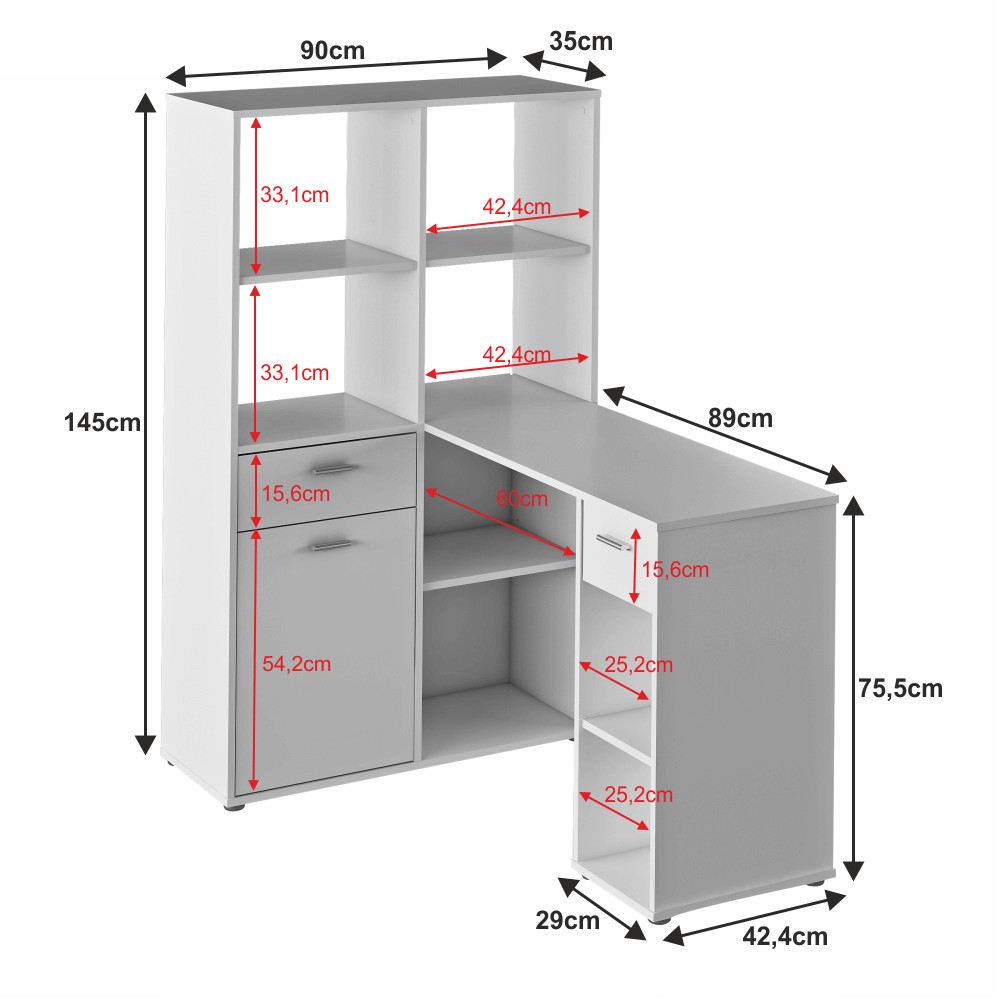 - Kialakítás: Könyvespolccal egybeépített multifunkciós íróasztal