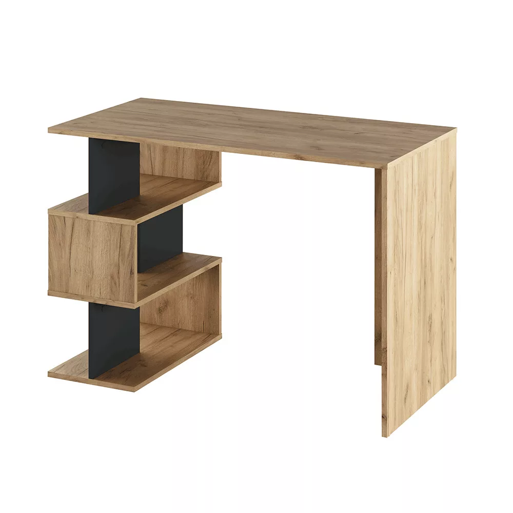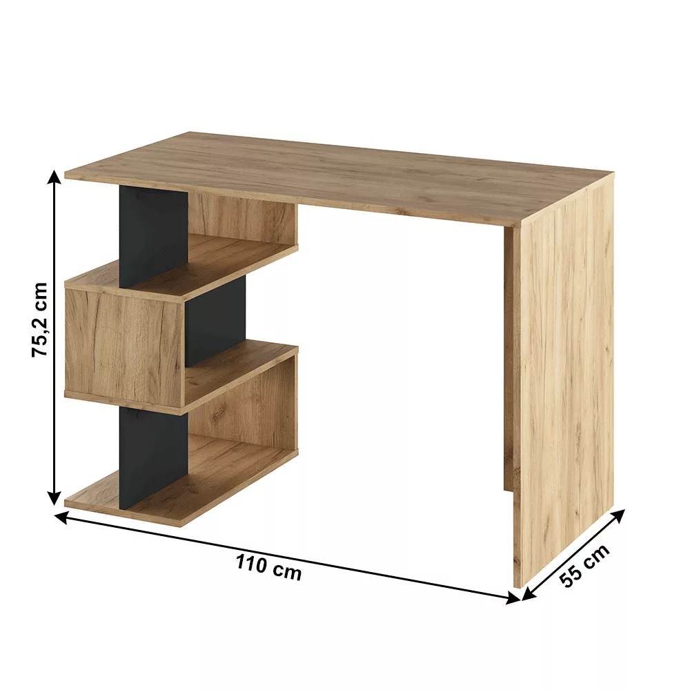 A hatékony munkavégzéshez és a zavartalan tanuláshoz elengedhetetlen egy jól szervezett, inspiráló környezet. Az ABES számítógépasztal precisely ezt a célt szolgálja, amely egyedi dizájnjával és modern kidolgozásával válik bármely dolgozó- vagy gyerekszoba központi elemévé. A strapabíró, 16 mm vastagságú laminált faforgácslapból készült, az artisan tölgy és a grafit elegáns kombinációjában. Az asztal különlegességét a nyitott polcok váltakozó, asszimetrikus elrendezése adja, amely nemcsak esztétikailag teszi egyedivé, hanem praktikus, nyitott tárhelyet is biztosít a legfontosabb eszközeid számára.