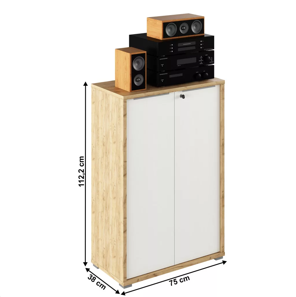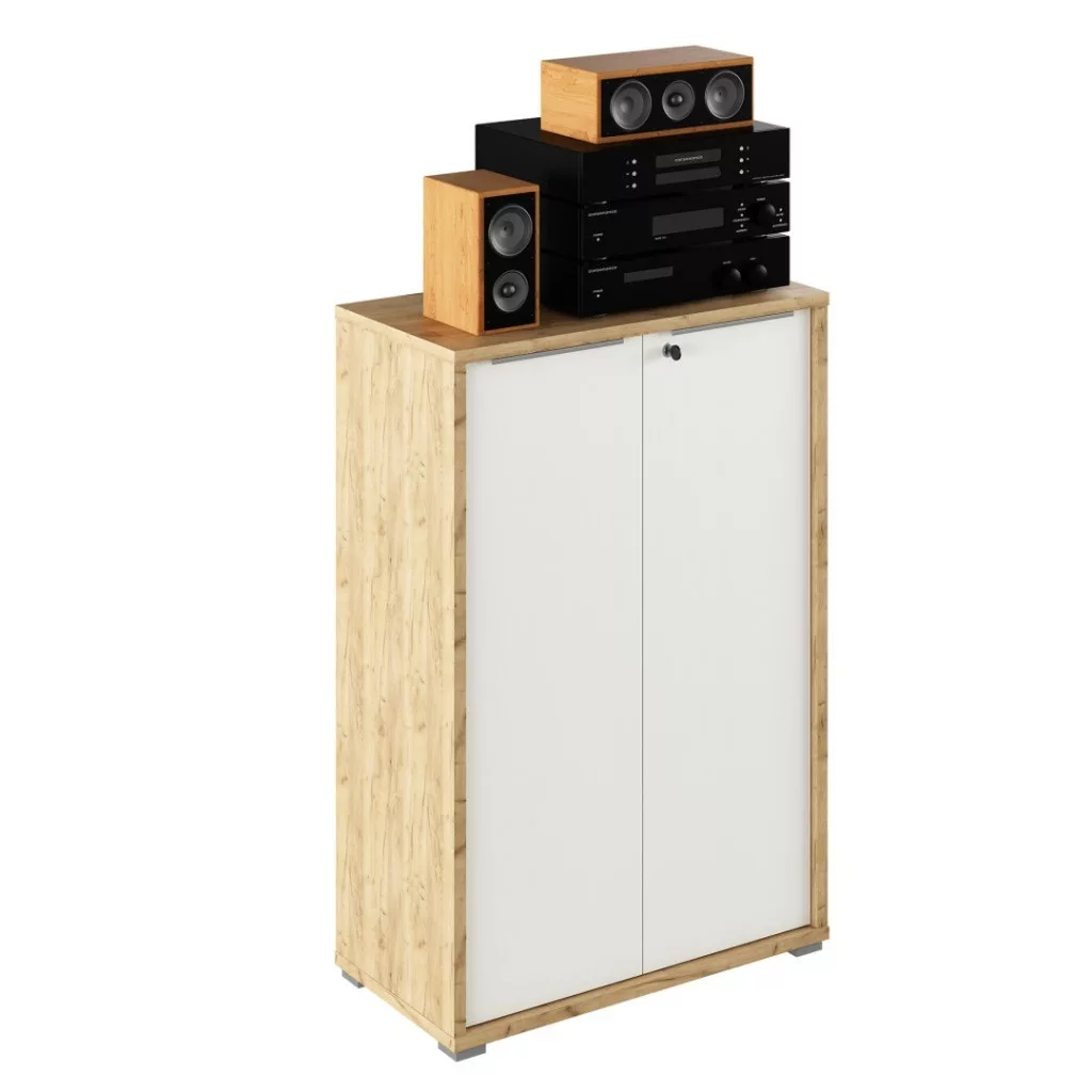 A hatékony munkavégzés alapja egy jól szervezett, inspiráló környezet. A RIOMA elemes irodabútor-család modern, harmonikus és funkcionális darabjai pontosan ezt a filozófiát képviselik, maximális kényelmet biztosítva a munkavégzéshez. Ez az artisan tölgy és fehér színkombinációjú, zárható, kétajtós kialakítású állvány tökéletes választás komplett irodák berendezéséhez, ahol az elegancia és a praktikum kéz a kézben jár.