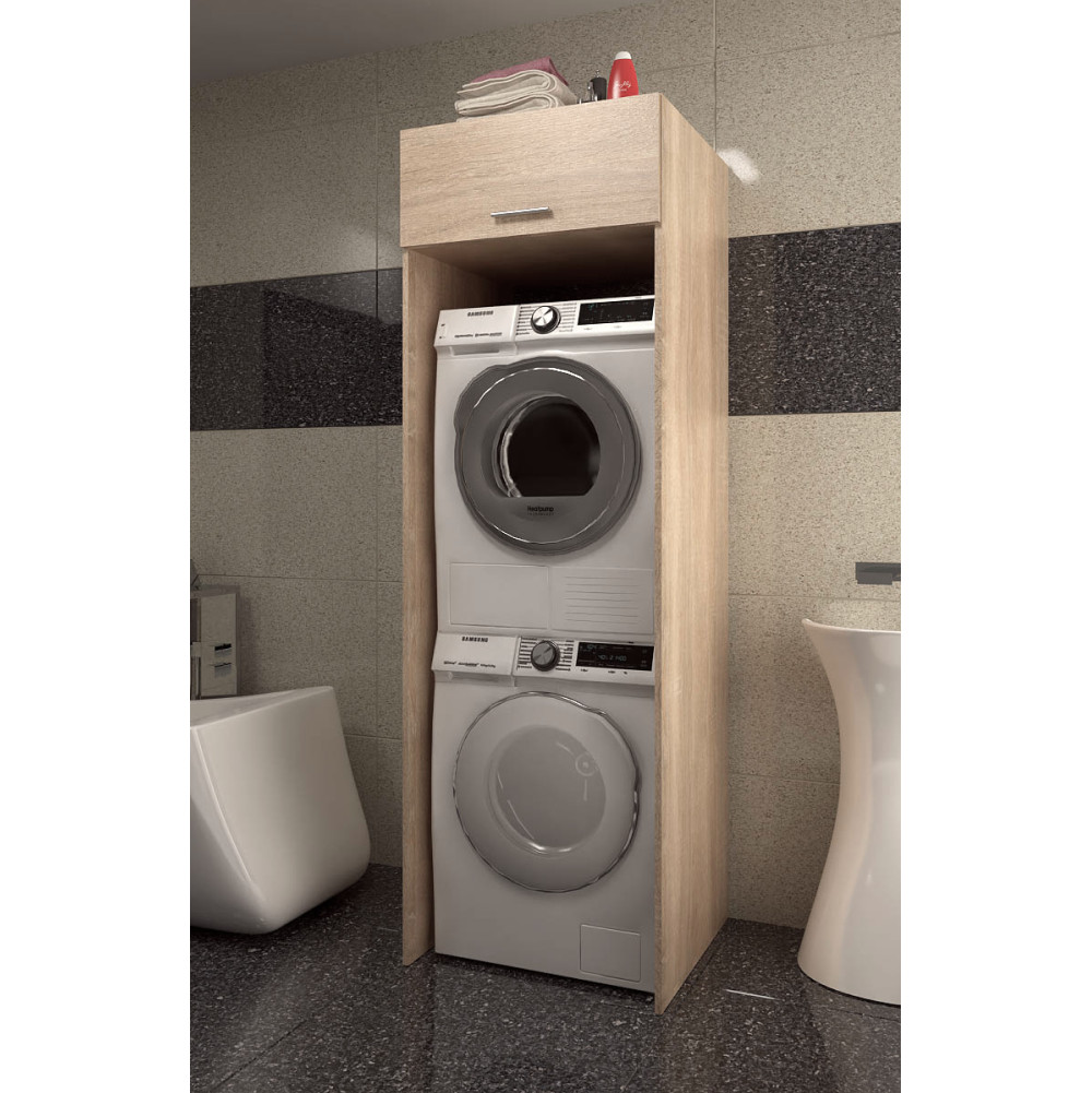 Gyakran érzed úgy, hogy a fürdőszobád vagy mosókonyhád tere korlátozott, és a rend fenntartása igazi kihívást jelent? A praktikus JERGI szekrény egy olyan átgondolt fürdőszobai tároló, amelyet kifejezetten a mosógép és szárítógép feletti, gyakran kihasználatlanul maradó hely optimális berendezésére terveztünk. Laminált DTD anyagból készült, időtálló sonoma tölgy színben, amely melegséget és modern eleganciát visz a térbe.