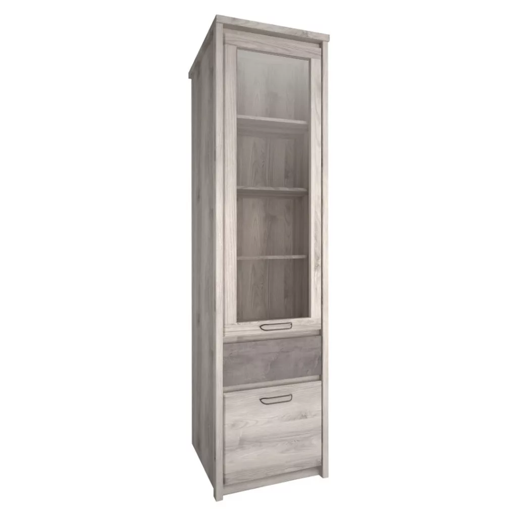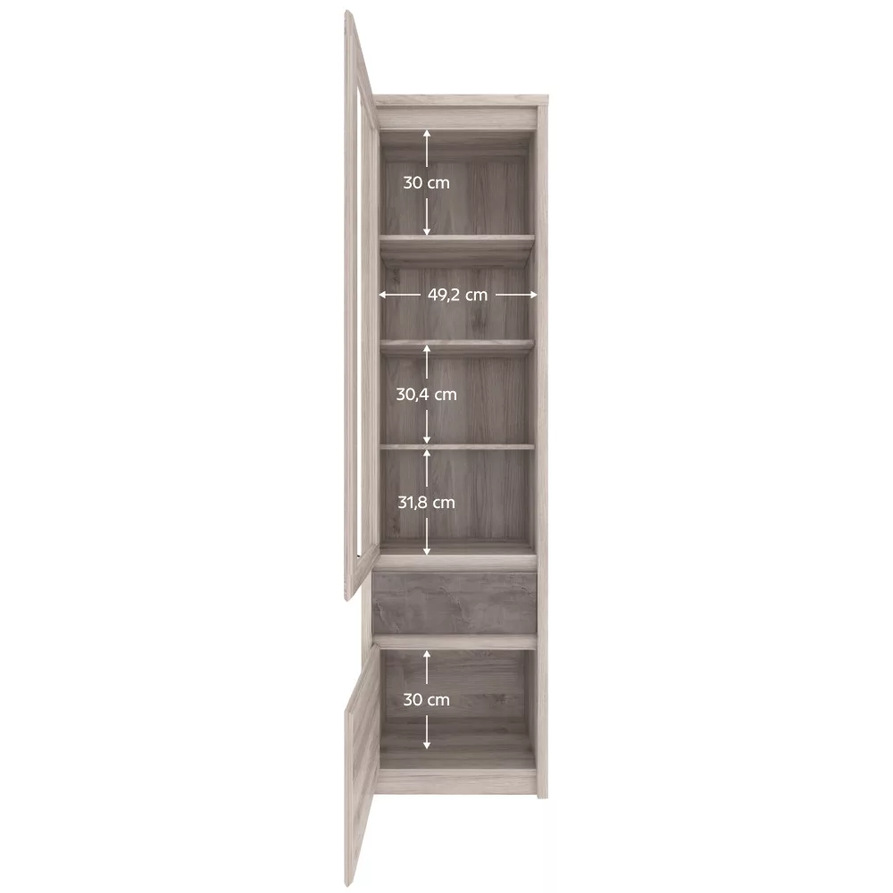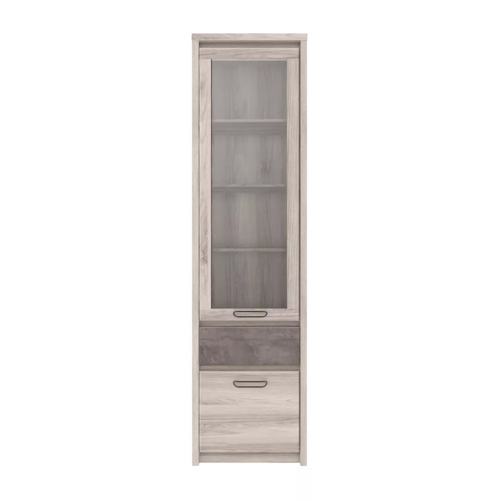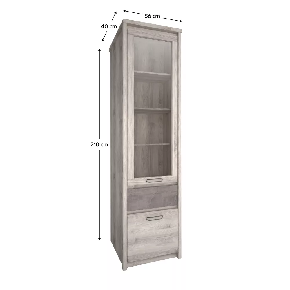 - Kialakítás: Praktikus, kétajtós vitrin, amely egyszerre üveges és polcos, egy tágas fiókkal kiegészítve