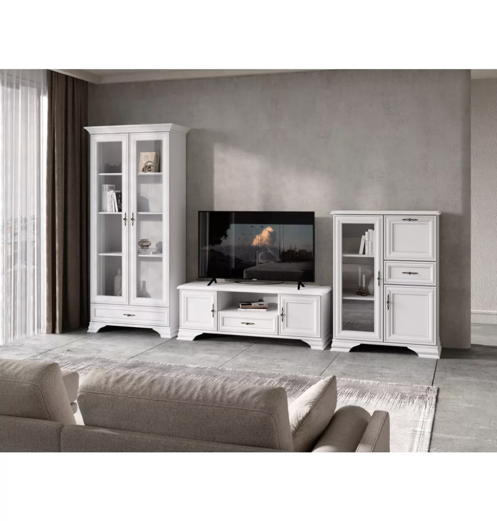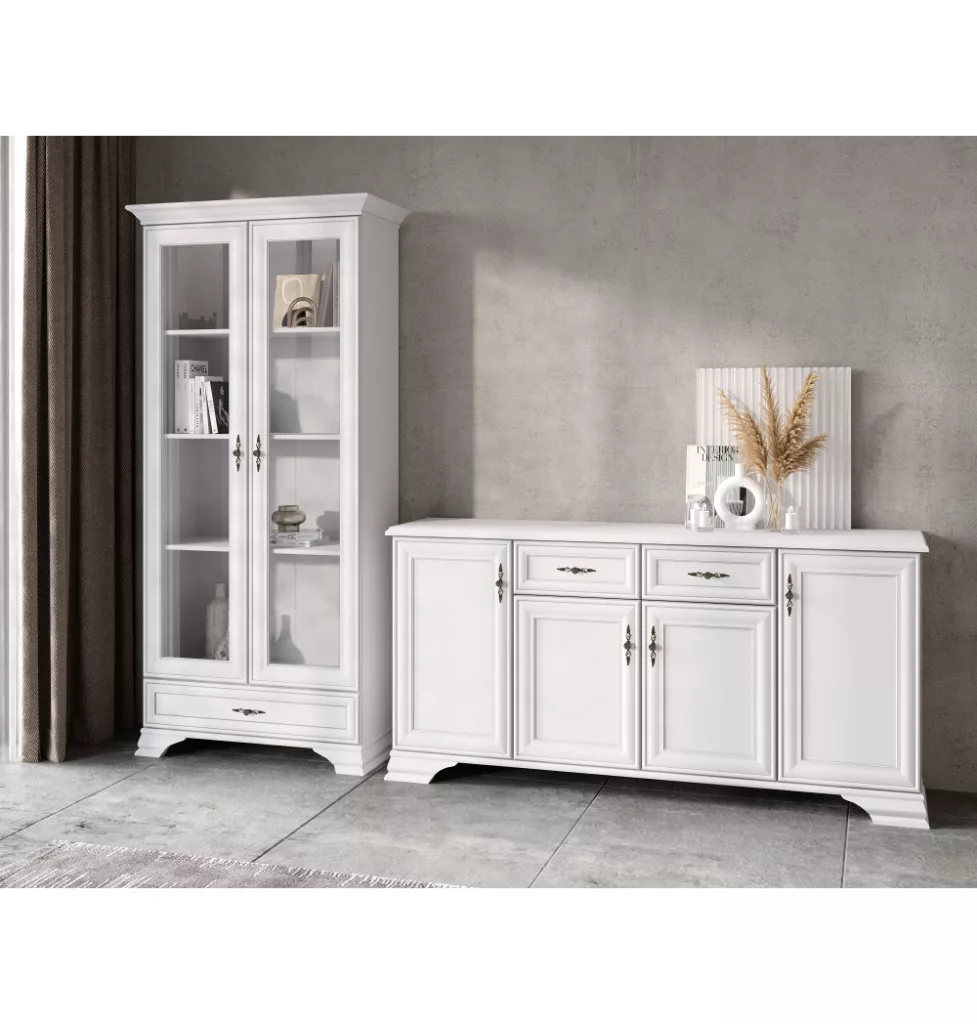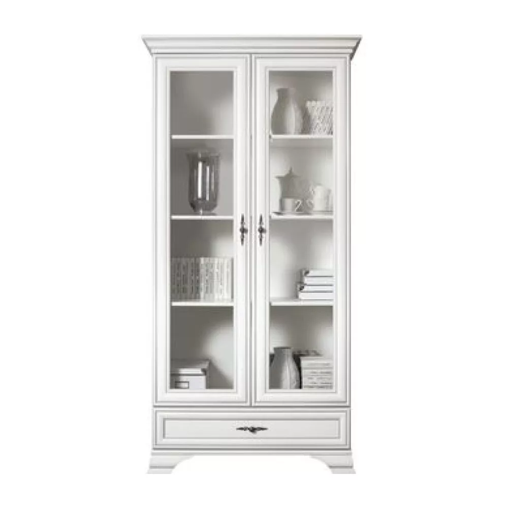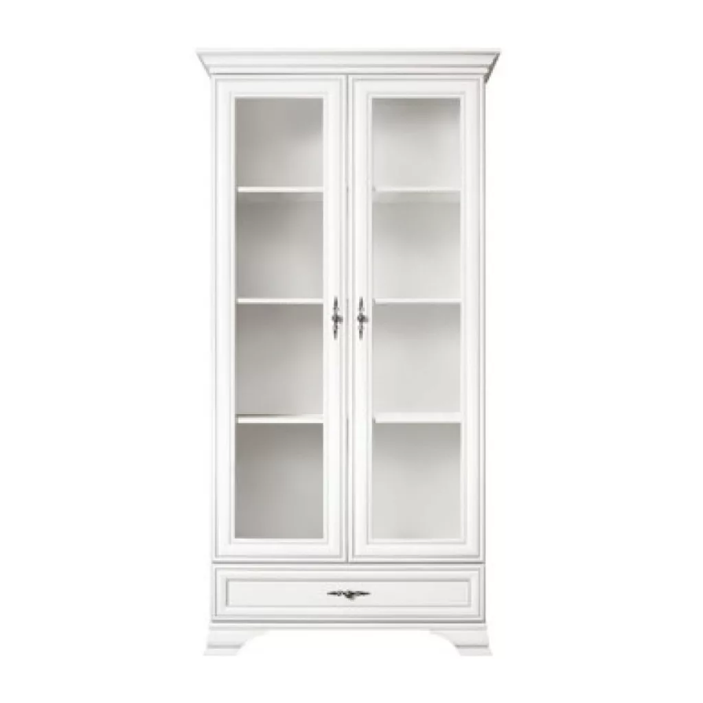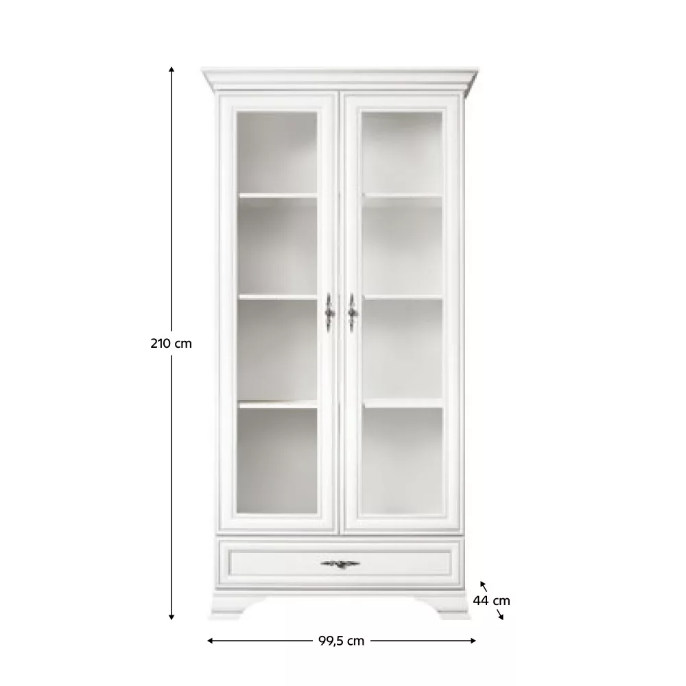 A KENT bútorcsalád ezen darabja egy praktikus és stílusos üveges szekrény, amelyet az időtlen dizájn és a sokoldalú felhasználhatóság jellemez. A finom, alpesi fehér színű, laminált DTD-ből készült testet az antik ezüst kivitelű, tartós fémből készült fogantyúk teszik igazán elegánssá. Letisztult megjelenésének köszönhetően otthonod szinte bármely helyiségében – a nappalitól az étkezőig – harmonikusan illeszkedik a környezetbe, legyen szó klasszikus vagy modern enteriőrről.