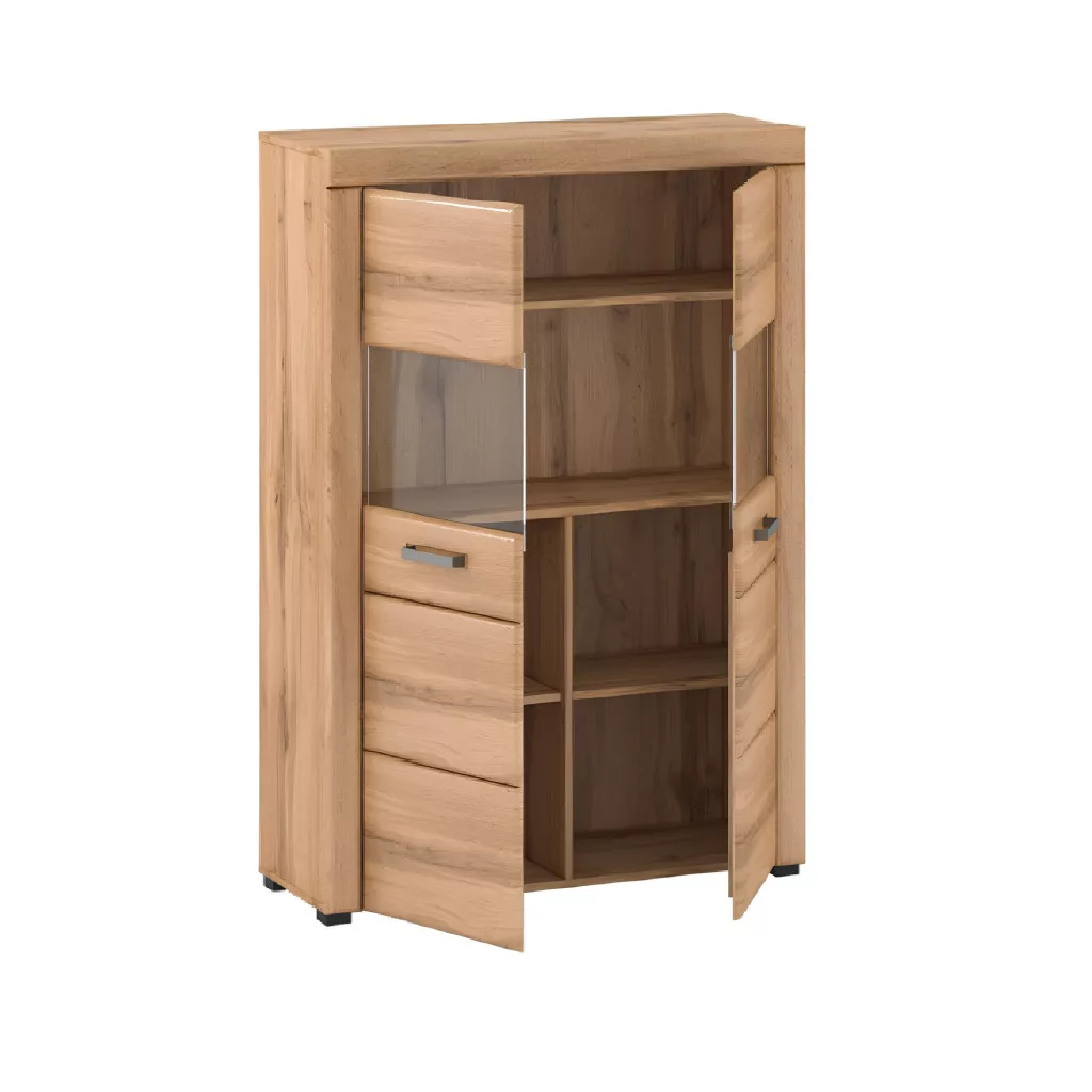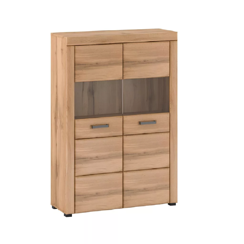 A kétajtós kialakítás bőséges tárolóhelyet rejt. Az elülső rész átlátszó üvegezése elegáns lehetőséget nyújt kedvenc dísztárgyaid, poharaid vagy könyveid bemutatására, így ez a vitrin otthonod ékességévé válhat. A belső polcrendszer praktikusan oszlik meg, hogy minden holmidnak megtaláld a helyét. Funkcionálhat mint elegáns edényszekrény, praktikus büfé vagy akár egy régmúltat idéző almárium modern megfelelője. Az élményt tovább fokozhatod a külön megvásárolható LED világítással, amely diszkrét fénnyel emeli ki a kiállított tárgyak szépségét.