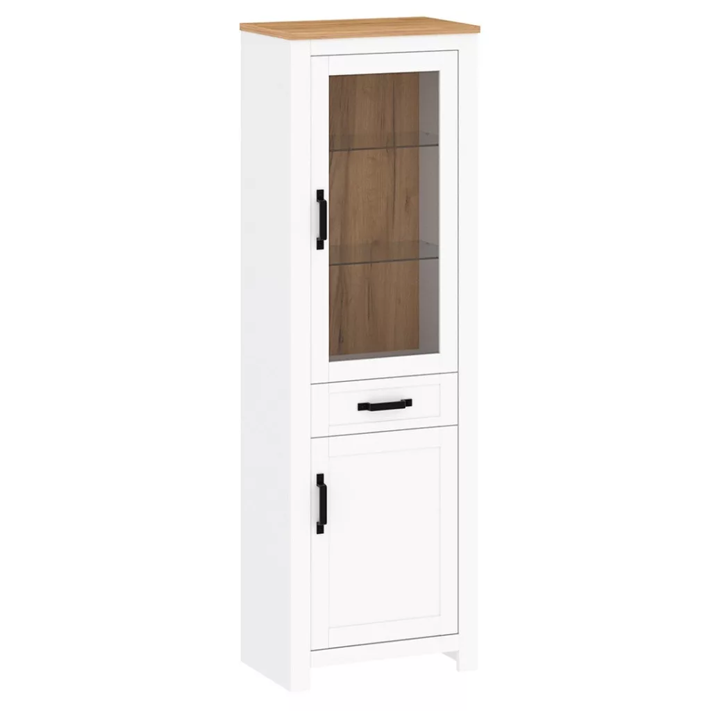 A vitrin felső, üvegezett ajtókkal ellátott része ideális a dekoratív tárgyak bemutatására, míg az alsó, zárt rész és a tágas fiók praktikus tárolóhelyet biztosít. A bútordarabhoz opcionálisan LED világítás is vásárolható, amellyel diszkrét fénnyel emelheted ki a kiállított tárgyak szépségét, így a szekrény egy igazi kiállító szekrénnyé válik az esti órákban. Az univerzális (B/J) kiszerelésnek köszönhetően az ajtók nyitási irányát a szerelés során Te döntheted el, így a bútort könnyedén a szoba adottságaihoz igazíthatod.