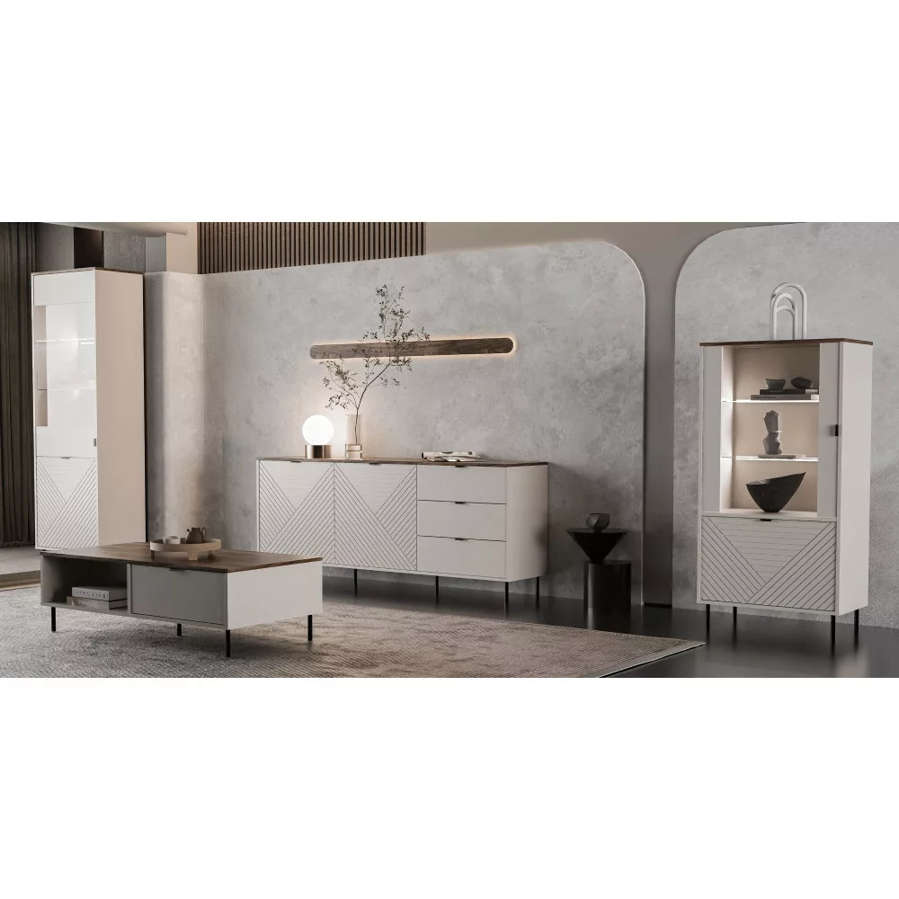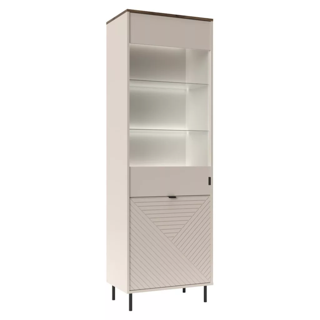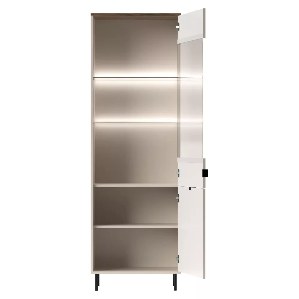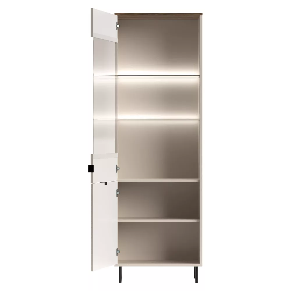 Ez a kifinomult üveges szekrény a kollekció egyik kiemelkedő darabja. A bútortest strapabíró laminált DTD-ből, az ajtók pedig elegáns fóliázott MDF-ből készültek, melyeket ABS élek védenek a mindennapi használat során keletkező sérülésektől. A meleg kasmír és a természetes castello tölgy színkombinációja harmonikus és modern légkört teremt, míg a fekete fém lábak és a finom fekete fém fogantyúk elegáns kontrasztot adnak, kiemelve a bútor letisztult vonalvezetését.