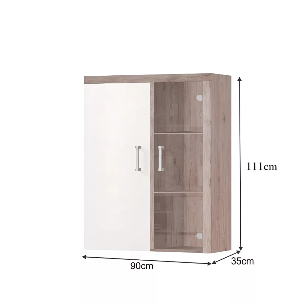 Ez a praktikus függő vitrín két ajtóval rendelkezik, melyek közül az egyik üvegezett, így ideális választás, ha egy elegáns kiállító szekrény vagy porcelán szekrény szerepét szánod neki. A belső polcos elrendezés segít a rendszerezésben, legyen szó könyvekről, dísztárgyakról vagy egy elegáns pohárszék tartalmának bemutatásáról. Funkcionalitása révén modern tálalóként is megállja a helyét, stílusos tárolási lehetőséget kínálva az étkező közelében.