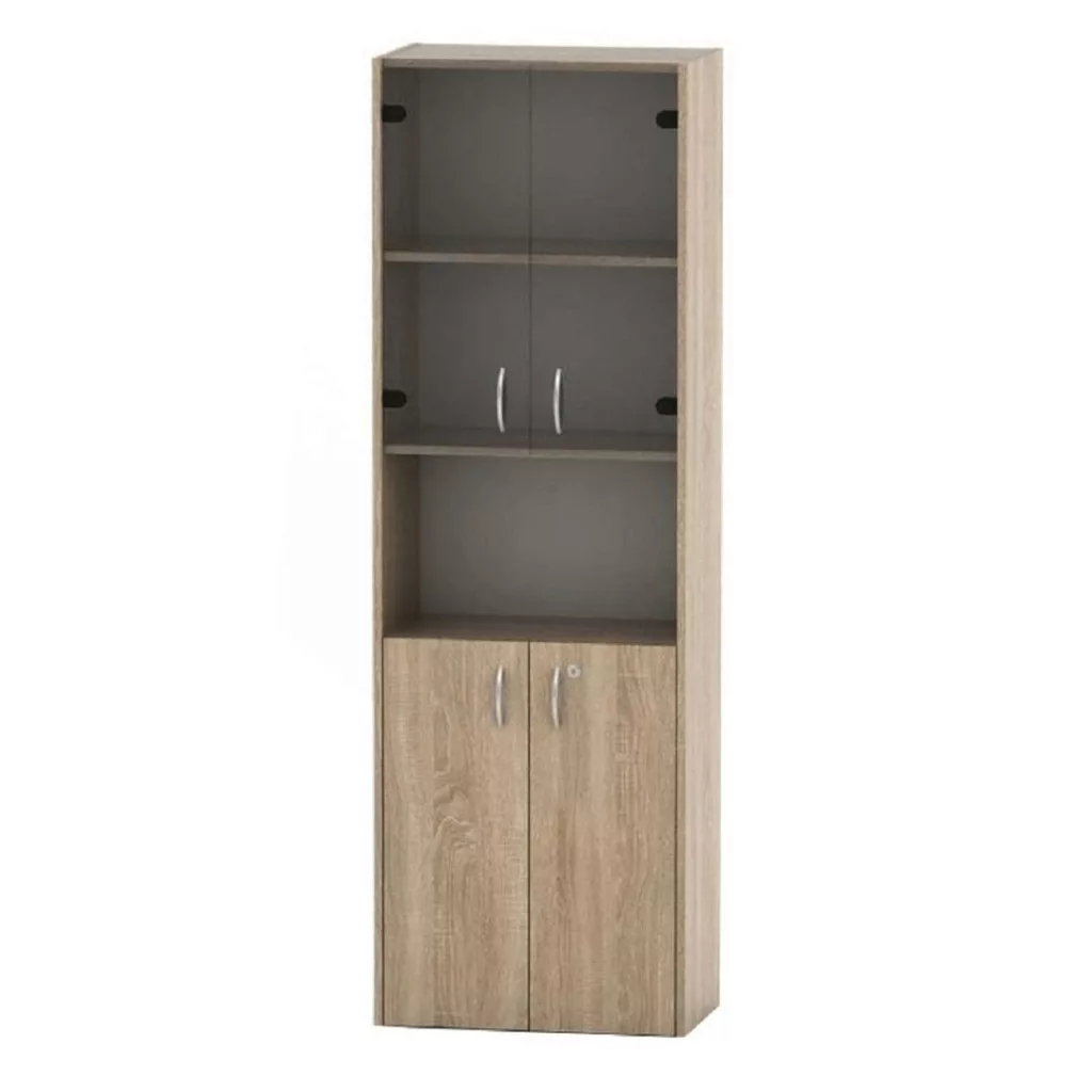 A szekrény kialakítása rendkívül átgondolt. A felső, üvegezett ajtók mögötti polcokon ízlésesen helyezheted el a céges díjakat, szakmai kiadványokat vagy akár dekoratív tárgyakat, így a bútordarab egyfajta kiállító szekrényként is funkcionál. Ebben a formában akár egy modern pohárszékként is megállja a helyét a tárgyalóban vagy az irodai konyhában. Az alsó, teli ajtós rész tágas rakodóteret rejt, amely ideális az iratok, irodaszerek és egyéb, szem elől elrejteni kívánt eszközök rendezett tárolására. A biztonságról a zárható ajtók gondoskodnak, így az értékesebb vagy bizalmas dokumentumokat is biztonságban tudhatod. Sokoldalúsága révén akár tálalóként vagy elegáns porcelán szekrényként is használható a cég reprezentatív tereiben.