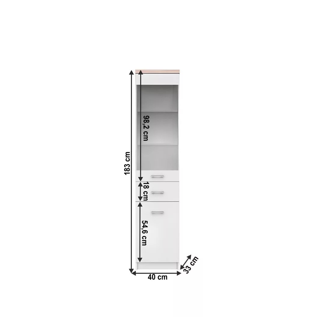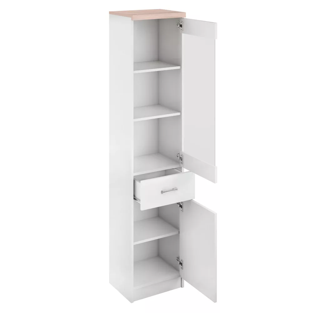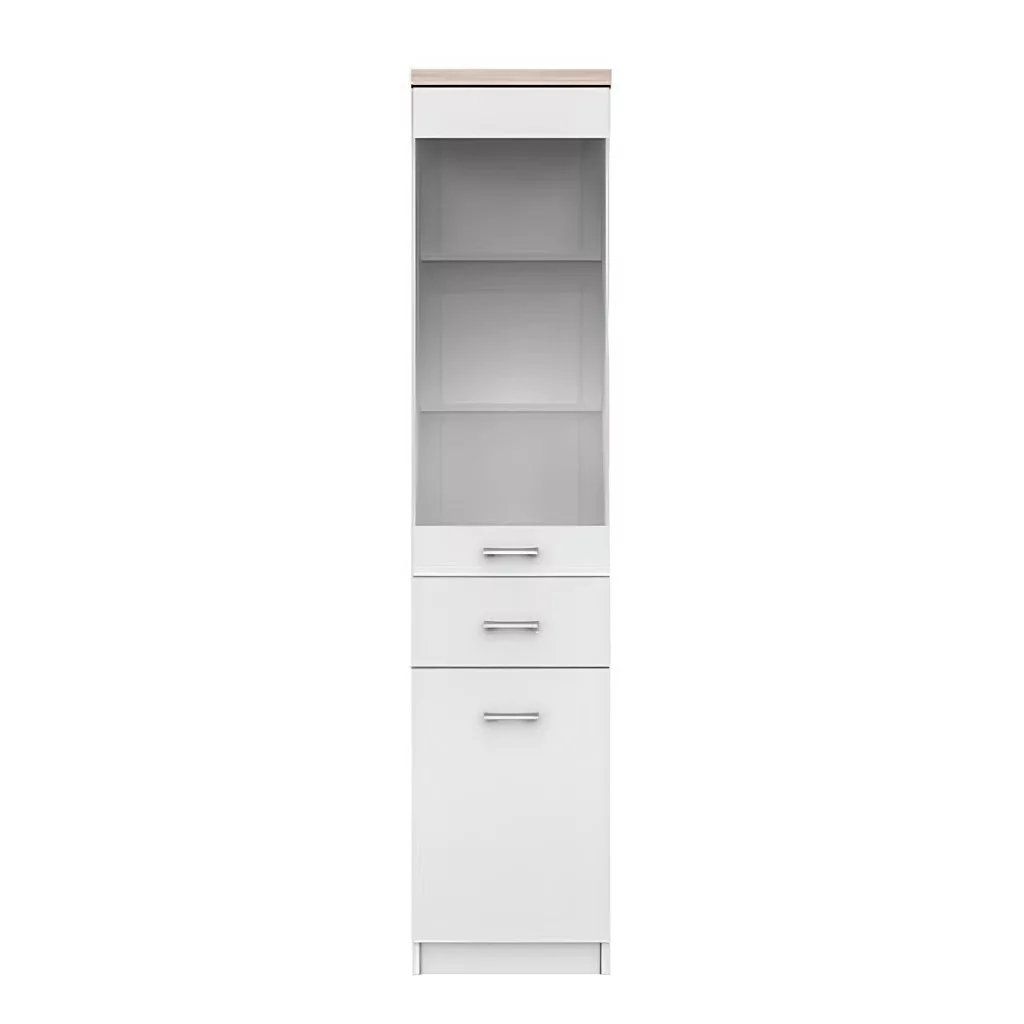 Ez a modern pohárszék funkcionálisan is kiválóan megtervezett. Az alsó, egyajtós rész tágas tárolóhelyet kínál, felette egy praktikus fiók található az apróbb tárgyaknak. A felső, üveges vitrines szekrény egy polccal van ellátva, amely ideális helyet biztosít a legszebb poharak, étkészletek vagy dísztárgyak bemutatására, felelevenítve a klasszikus kredenc vagy almárium hangulatát egy kortárs formában. Sokoldalúsága révén akár mint tálaló vagy büfé is megállja a helyét az étkezőben.