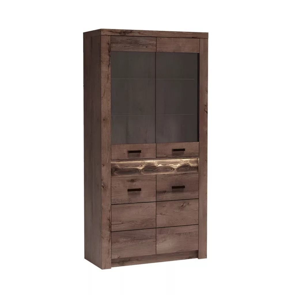 Funkcionalitását tekintve ez az üveges szekrény rendkívül praktikusan lett kialakítva. A felső, két üvegajtóval ellátott részben két polc található, amely ideális helyet kínál egy elegáns pohárszék vagy porcelán szekrény szerepének betöltésére. Az alsó, zárt szekrényrész egy további polccal diszkrét tárolási lehetőséget nyújt. Különlegessége a két részt elválasztó, masszív fából készült polc, amely alulról megvilágítható, így kiemelve a rajta elhelyezett tárgyak szépségét (a LED világítás külön megvásárolható).