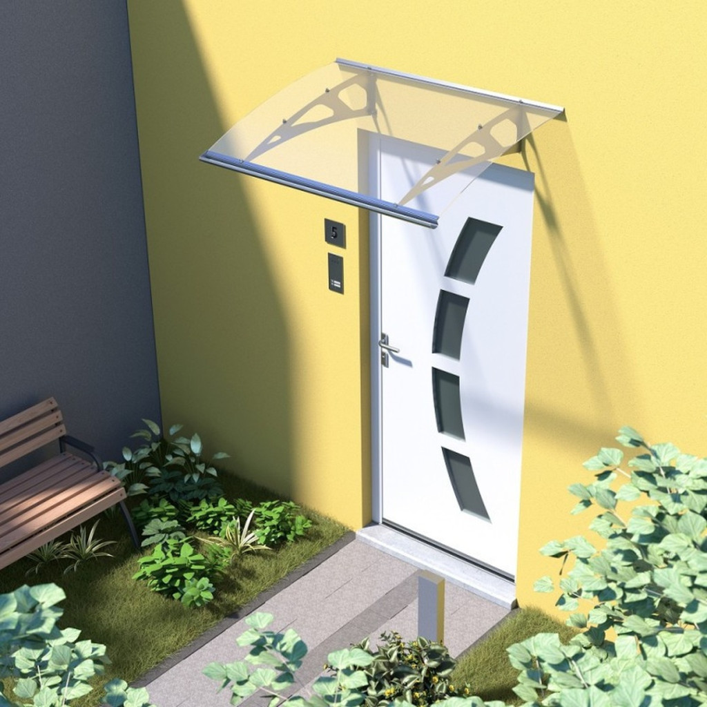Bejárati előtető az ajtó felett eloxált alumíniumból. Az alumínium szerkezetű tető, ellentétben a tetővel, amely szerkezete műanyag felhasználásával készült, kiválóan ellenáll az időjárásnak és évek múltán is szilárd és stabil. A téli fagyokban nem válik törékennyé, és ugyanakkor az erős napsütés hatása alatt nem változtatja a színét. A tető beüvegezése 4 mm vastagságú átlátszó plexiüveg.