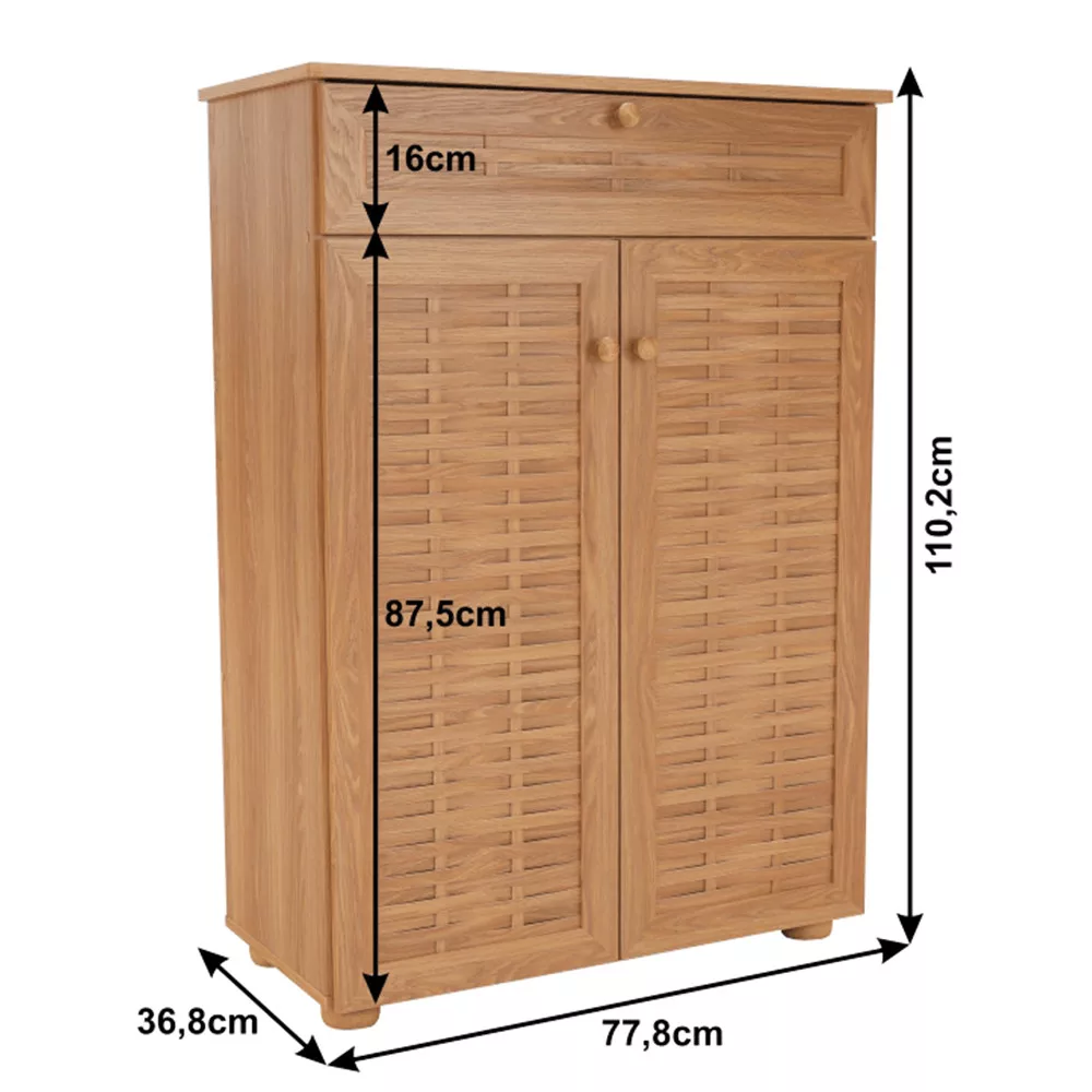 A kétajtós kialakítás mögött tágas belső tér rejlik, ahol négy polcon kényelmesen rendszerezheted lábbelijeidet. A szekrény felső részében egy praktikus fiók is helyet kapott, amely ideális a kulcsok, sálak, kesztyűk vagy egyéb apróságok tárolására, így minden kéznél lesz, amikor szükséged van rá.
