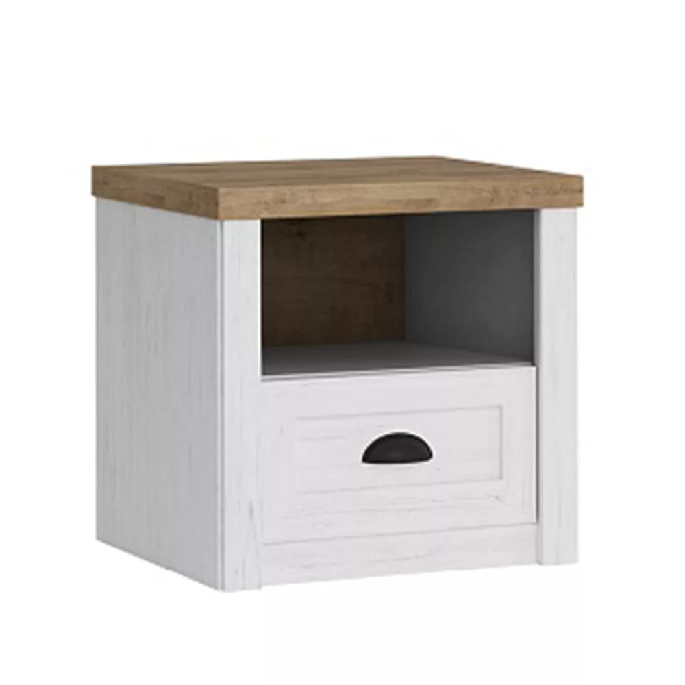 A világos andersen fenyő és a meleg árnyalatú lefkas tölgy színkombinációja eleganciát sugároz, miközben kiemeli a bútor természetes, rusztikus hatását. Nem csupán egy esztétikus bútordarab, hanem egy praktikus tárolóasztal is, amely segít rendet tartani az ágyad mellett. A tágas, nyitott rakodótér ideális a kedvenc könyveidnek vagy egy dísztárgynak, míg a fiókban diszkréten tárolhatod a személyesebb apróságokat. Masszív, 36 mm vastagságú felsőlapja stabil helyet biztosít egy éjjeli lámpának, egy pohár víznek vagy a telefonodnak.
